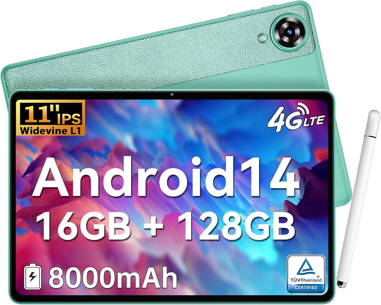 Tablet 11 Zoll, Android 14 mit 8000mAh, 16GB RAM + 128GB ROM (1TB TF), 1280x800 FHD | 5G WiFi | 4G SIM | BT5 | 5MP + 13MP | GMS-Zertifiziert | Tablet mit Stift