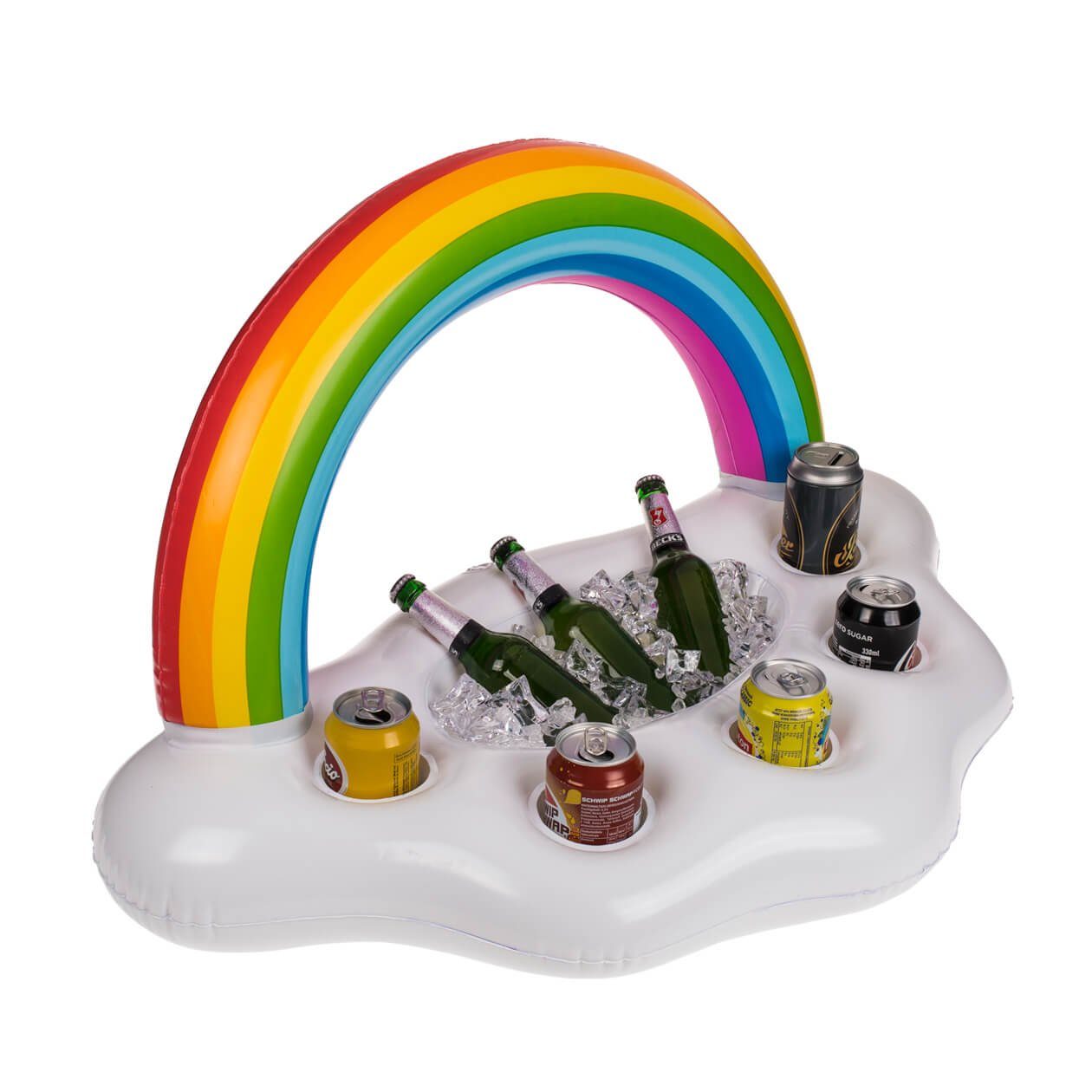 Extra groß für richtig Platz. Platz für Flaschen, Gläser oder Dosen. Auch kann man einen Bereich mit Eis füllen und darin die Getränke kühlen. Die Form ich eine Wolke mit Regenbogen. Sicher der Hit auf Ihrer nächsten Poolparty.