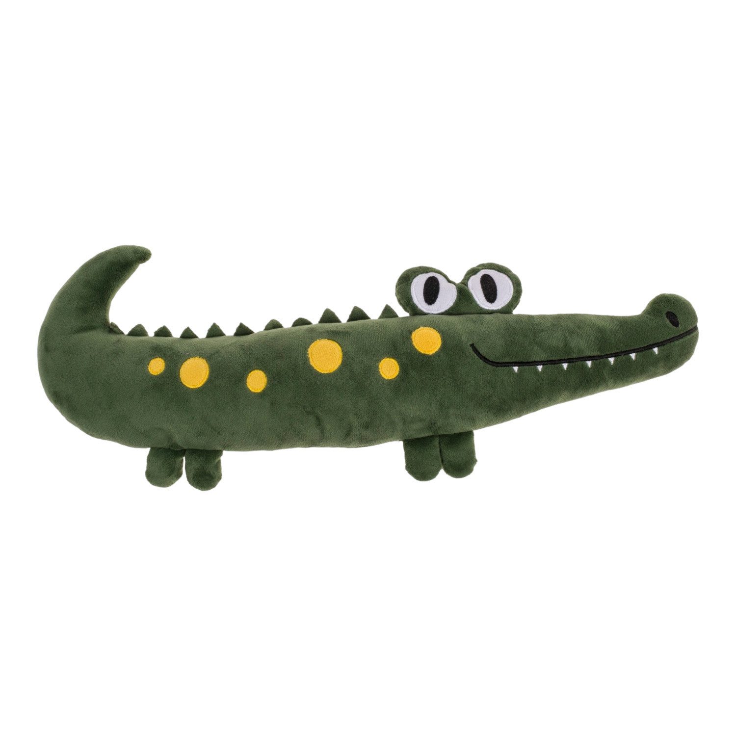 Kuschelkissen als lächelnder Alligator in Grün mit gelben Tupfen, nicht nur Spielzeug, sondern auch Deko, mit hohem Knuddelfaktor.