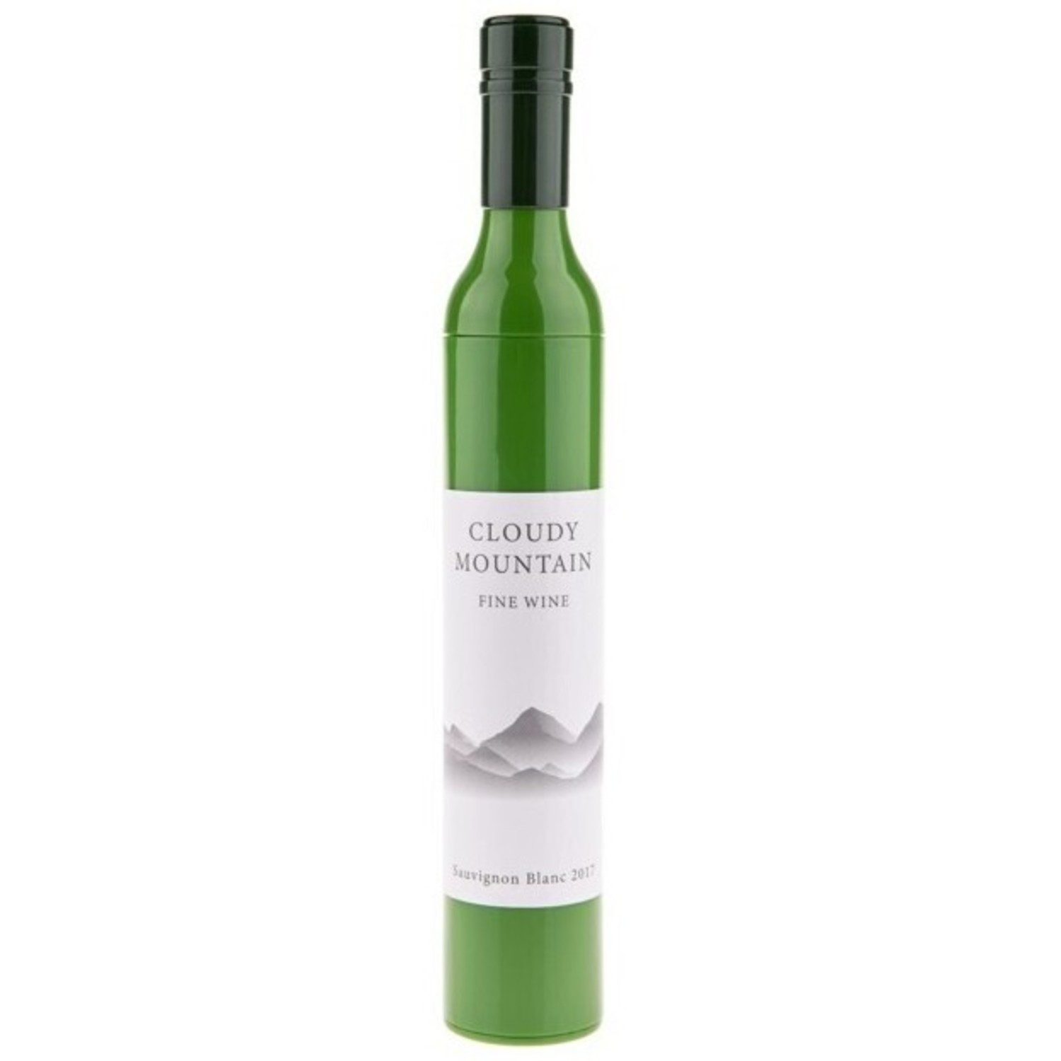 Der Regenschirm sieht von aussen aus wie eine Weinflasche. Macht man ihn auf, kommt ein grüner Regenschirm zum Vorschein.