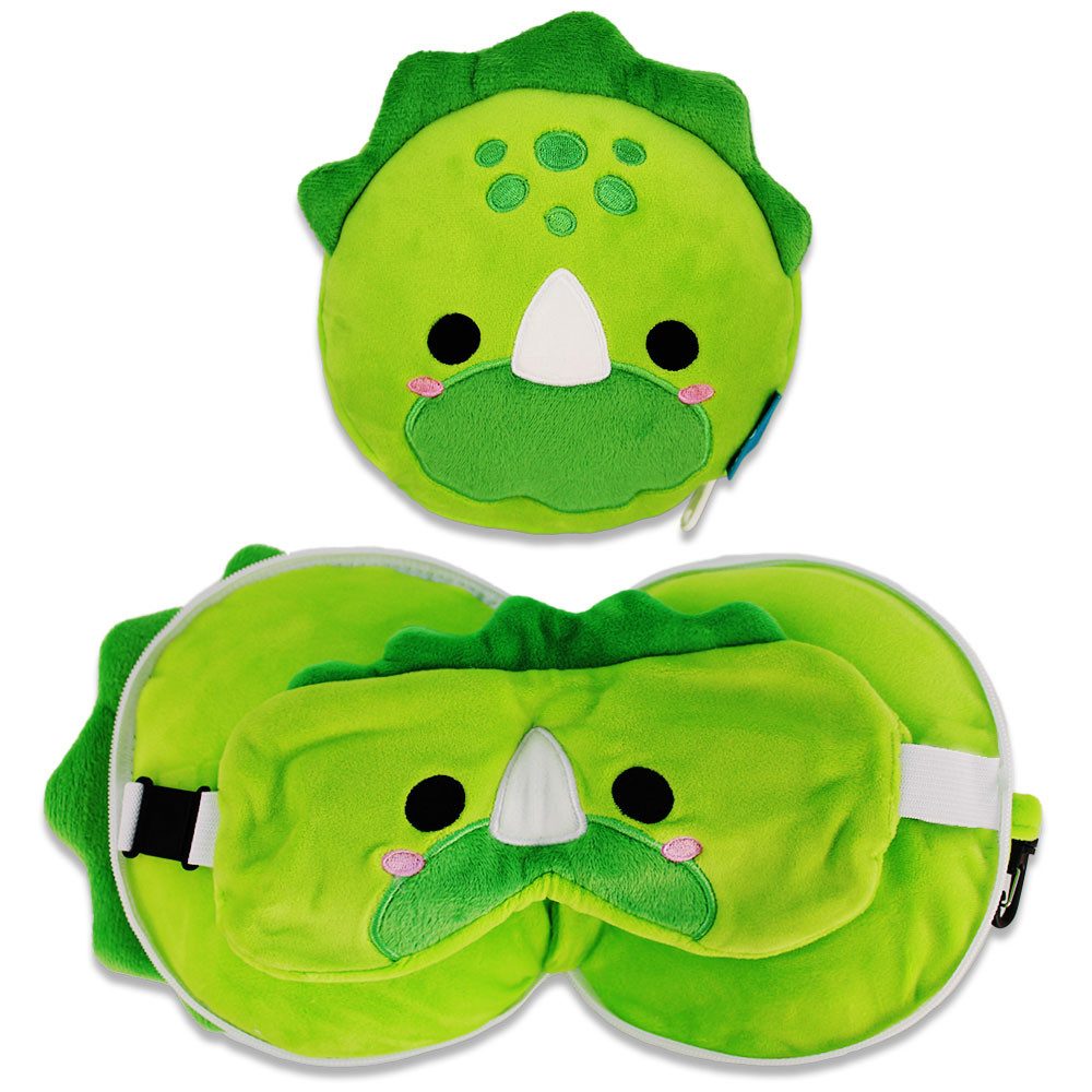 Praktische 2-in-1-Funktion: Dieses Kissen kombiniert ein weiches Kuschelkissen mit einer Dinosaurier-Schlafmaske – perfekt für Reisen oder gemütliche Stunden zu Hause.