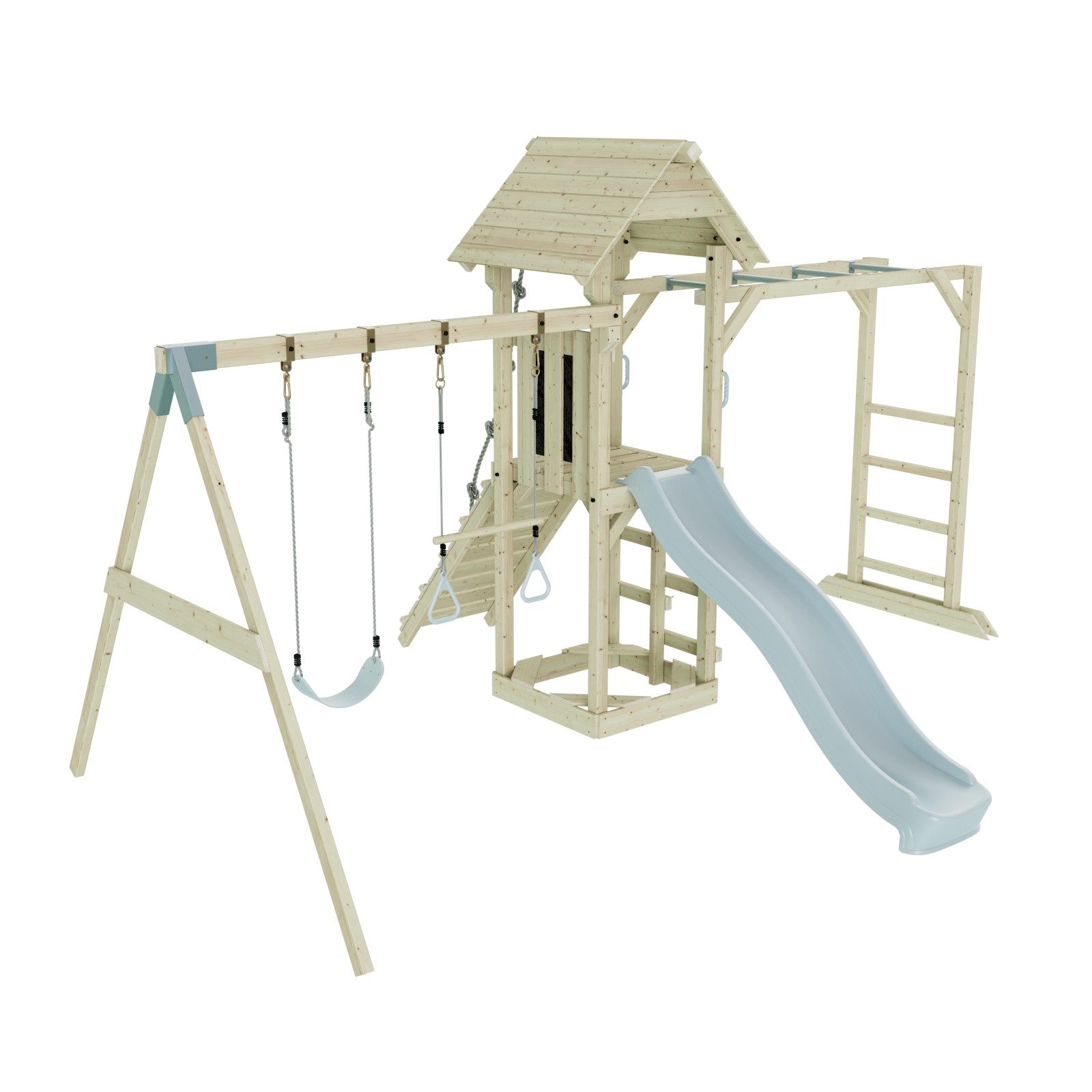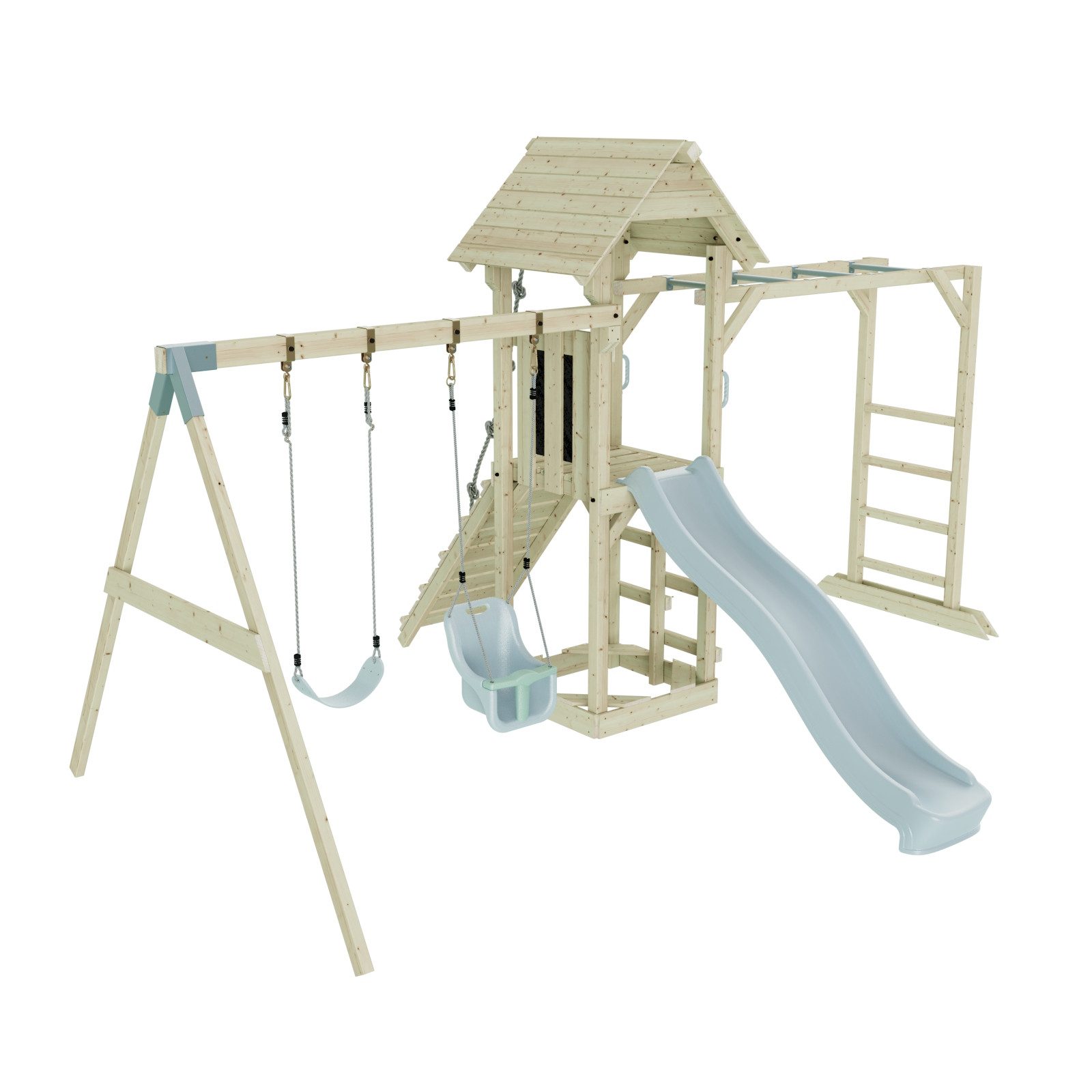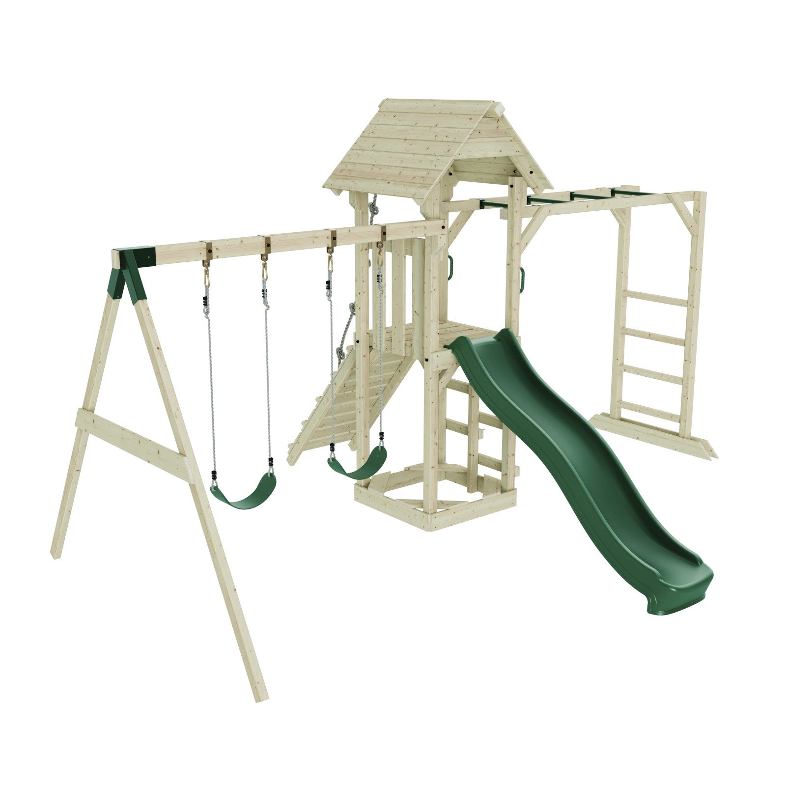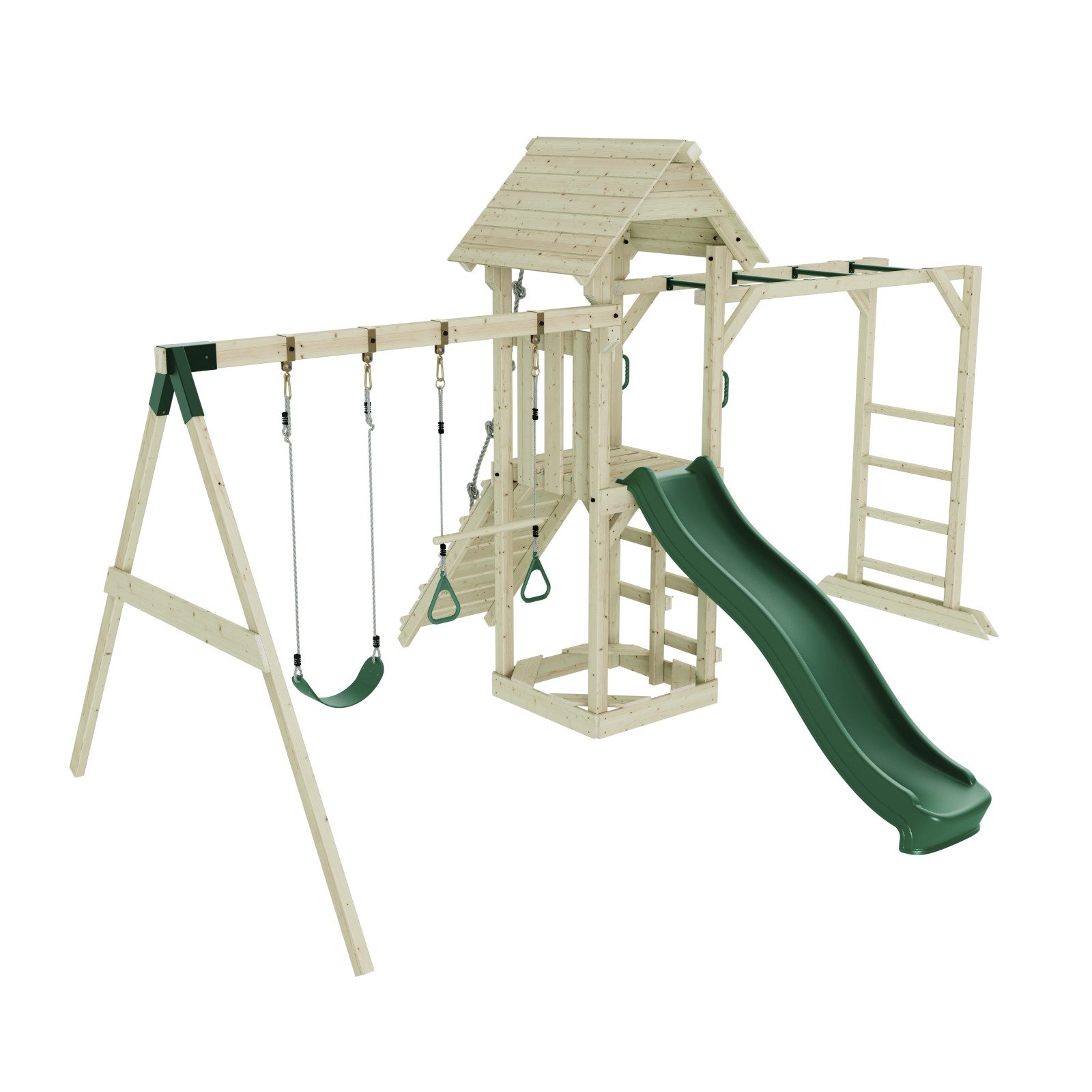 Описание товара (мы ещё работаем над переводом, извините за неудобство): , Bist du bereit für eine actiongeladene Reise ins Abenteuer? Der OutdoorToys Spielturm Örebro wird dein perfekter Begleiter sein, wenn es darum geht, aufregende Erlebnisse zu erleben. Hier warten Rutschspaß, Schaukelspaß und Hangelstangen-Action auf dich! Entdecke, wie weit du kommst, und lass dich von den Erwachsenen, die ihn nach der schwedischen Stadt Örebro auch als "Das kleine Abenteuerland" bezeichnen, inspirieren! Stabile Konstruktion aus unbehandeltem Holz , Moderne Designs , 10 Jahre Garantie auf Holzelemente Produktdetails: 2m langer Hangelstangen Abschnitt Kreidetafel optional erhältlich Maximales Gewicht: 50 kg pro Benutzer Farbe: Smaragdgrün Im Lieferumfang enthalten: Kletterturm Kletterseil und -leiter 4 Hangelstangen 1x Kinderschaukel &, 1x Trapezstange 220 cm Wellenrutsche 4er Set Bodenanker Sicherheitshinweise: Nicht für Kinder unter 3 Jahren geeignet Nur für den Haus-/Privatgebrauch geeignet Benutzung nur unter unmittelbarer Aufsicht von Erwachsenen Montagehinweis: Das Holz ist nicht vorgebohrt, eine vollständige Anleitung liegt bei der Lieferung bei. ,Wir empfehlen unsere Holzlasur zur Behandlung des Holzes. ,Für die Montage dieses Produkts werden Werkzeuge einschließlich einer Bohrmaschine benötigt. Benutzungshinweis: Dieser Artikel ist aus unbehandeltem Holz gefertigt und kann Risse aufweisen. Dies hat keinen Einfluss auf die Struktur oder Stärke des Artikels, auch wenn bei der Lieferung Risse im Holz vorhanden sind, ist dies völlig normal und beeinträchtigt nicht die Stärke und Haltbarkeit des Produkts. Die Outdoor Toys Holzlasur schützt unbehandeltes Holz auf nachhaltige Weise vor Witterung und Schädlingen. Die Holzlasur ist ,nach der DIN EN 71-3 Norm getestet und somit bestens für Kinderspielgeräte geeignet. Bitte beachte, dass dieser Schutz nur erreicht werden kann, wenn die Behandlung vor der Montage des Kinderspielgeräts erfolgt. Diese kannst du im Zubehör erwerben. Dieses Produkt wurde in Übereinstimmung mit der Spielzeugsicherheitsverordnung DIN EN 71 entworfen und hergestellt. Все angegebenen Maße und gezeigten Farben können geringfügig abweichen.