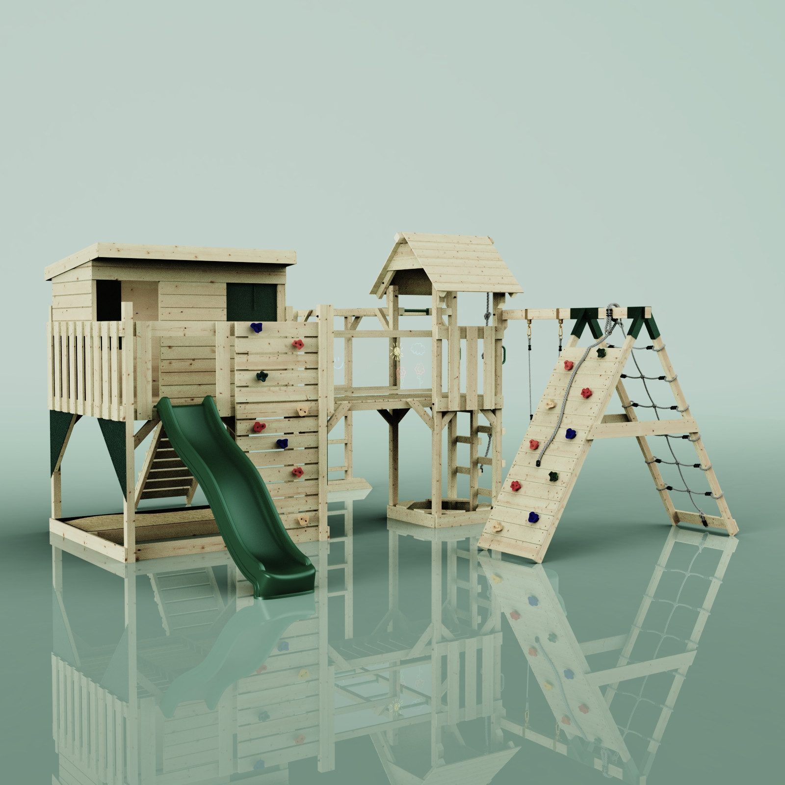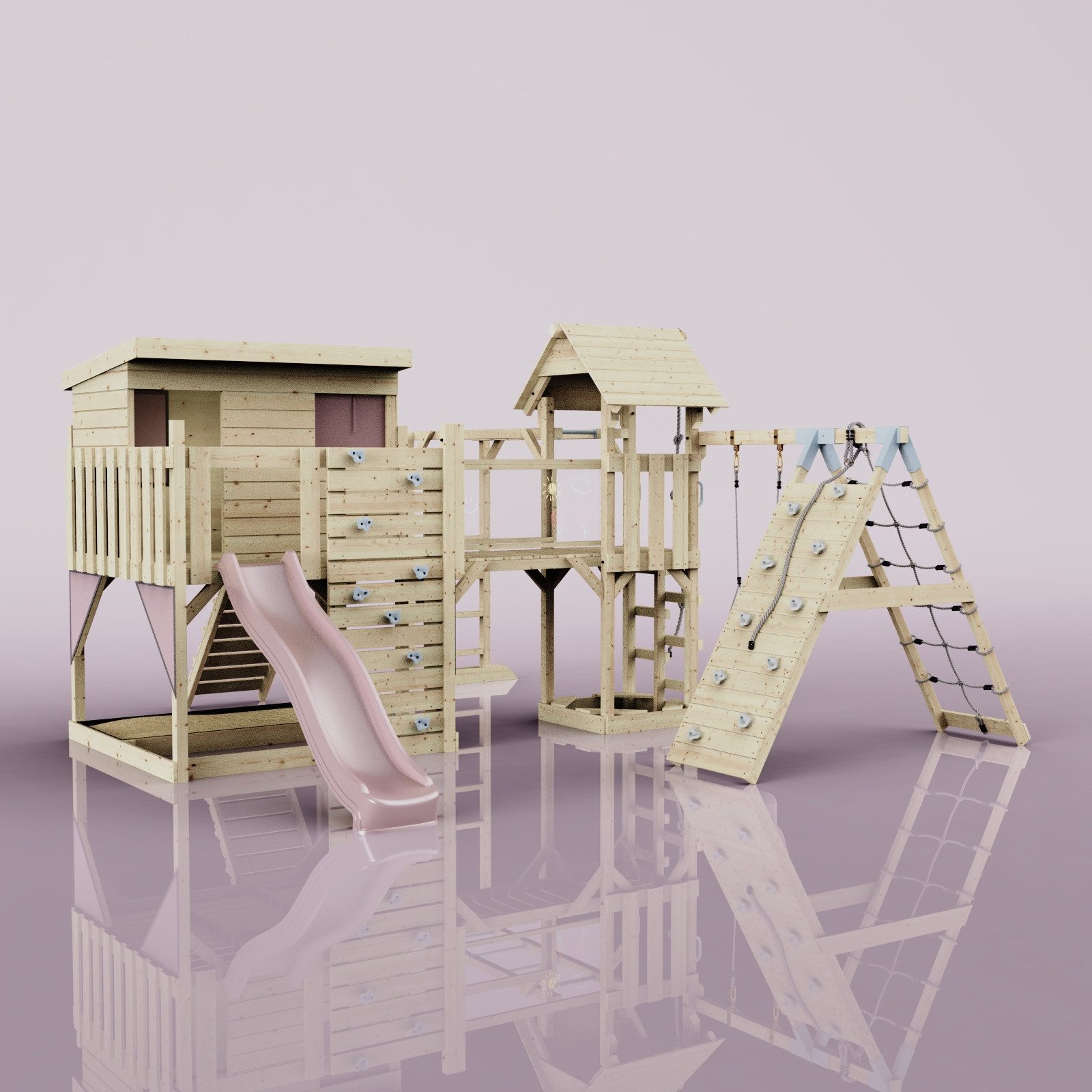 aus Holz in Eisblau mit Kinderschaukel & Rutsche, Kletterwand