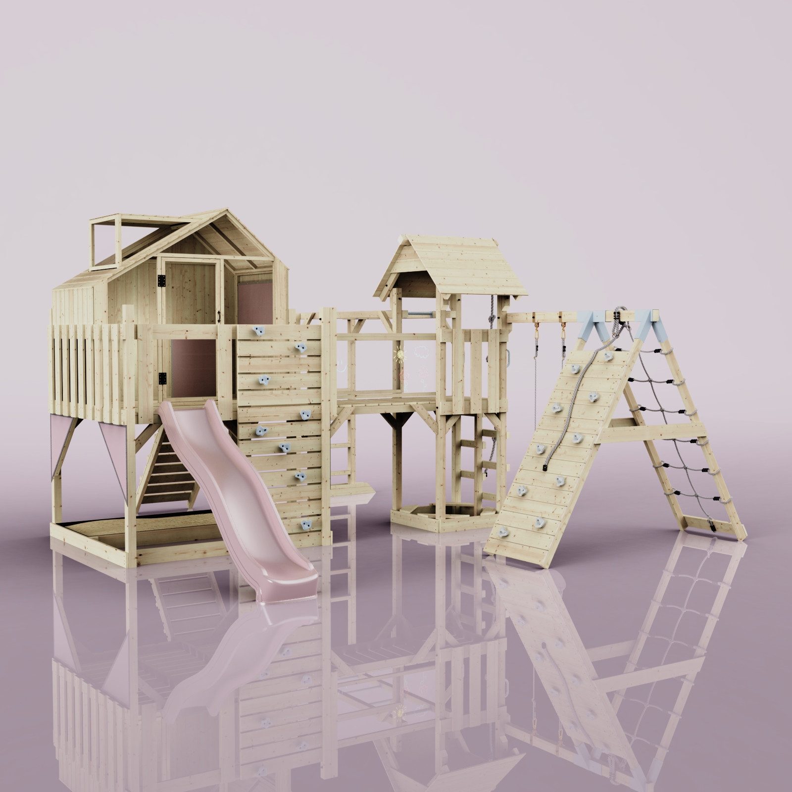 Entdecke den Kinderspielturm "Bo" – ein vielseitiger Holzspielplatz mit Spielhäusern, Kletterwand, Rutsche, Schaukel und Brücke. "Bo" bringt Abenteuer und Freude in deinen garten und fördert die motorischen Fähigkeiten deiner Kinder. mit "Bo" erleben Kinder stundenlangen Spielspaß in einer sicheren Umgebung.