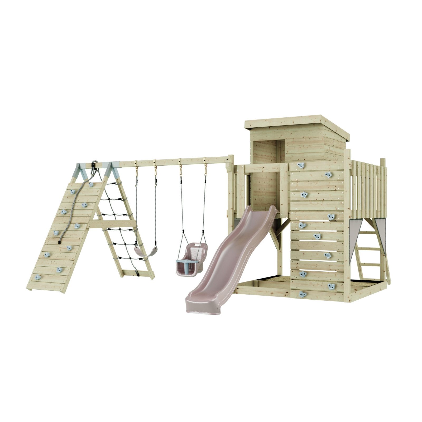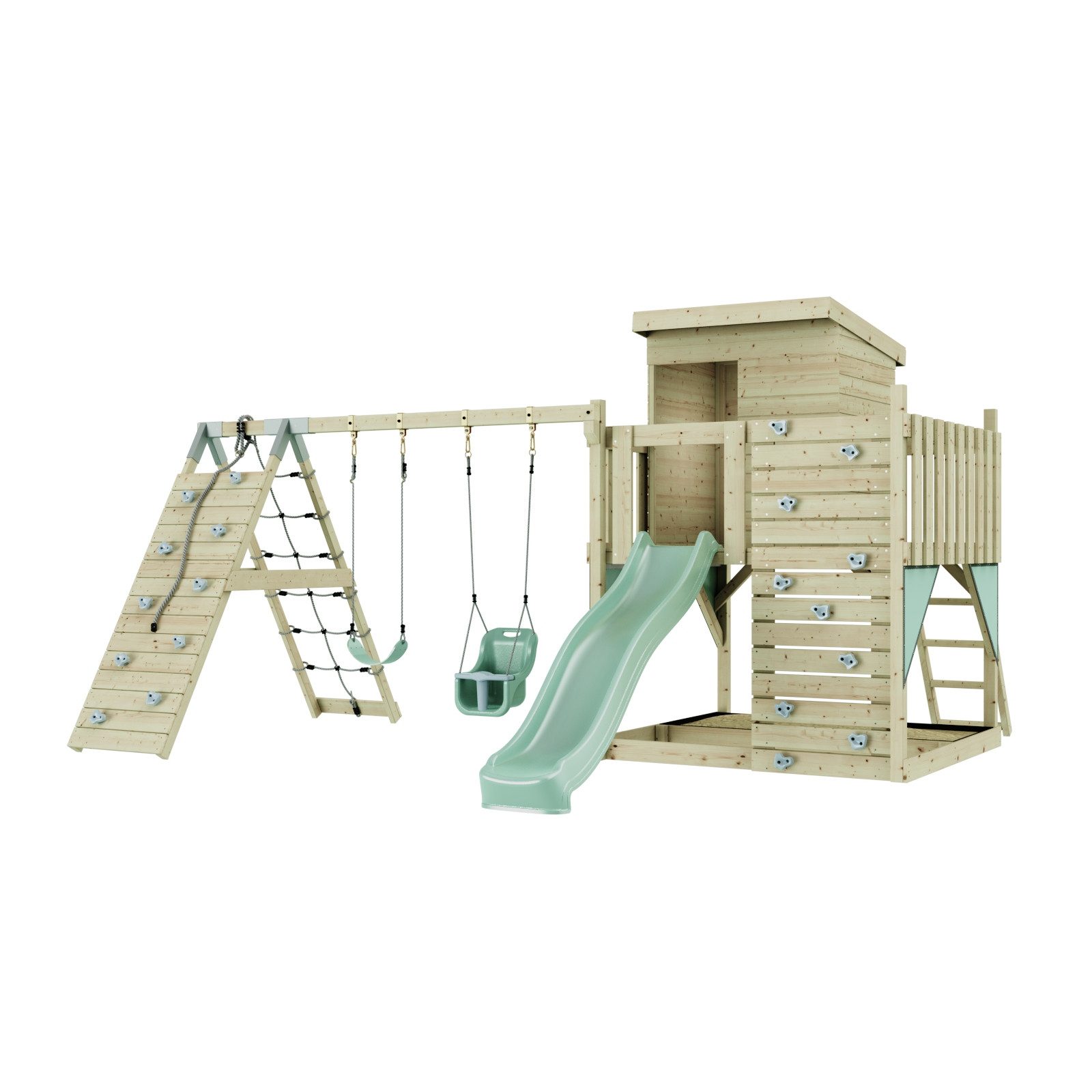 Erlebe die zauberhafte Welt des OutdoorToys Spielturms Frida! Dieser Allrounder bringt nicht nur ein gemütliches Spielhaus mit, sondern auch eine Doppelschaukel, eine Rutsche und eine Kletterwand für grenzenlosen Spielspaß. In den pastelligen Farben, die sich perfekt in deinen Garten einfügen, wird der OutdoorToys Spielturm Frida zum Lieblingsort für kleine Entdecker. Der Bereich unter dem Spielturm kann als Sandkasten genutzt werden. , Stabile Konstruktion aus unbehandeltem Holz Modernes Spielhaus Spritzgegossene Wellenrutsche Aufstiegsleiter auf die Plattform Höhenverstellbare Schaukelseile Pulverbeschichtete &, verzinkte Schaukelaufhängungen , Produktdetails des OutdoorToys Spielturms: Doppelschaukel 50 kg Maximalgewicht Длина: 468 ,cm Höhe: 260 ,cm Breite: 414 ,cm 120 cm Plattformhöhe 220 cm Rutschenlänge Farbe: Mintgrün Ausführung: Kinderschaukel Sicherheitshinweise: Nicht für Kinder unter 3 Jahren geeignet Nur für den Haus-/Privatgebrauch geeignet Benutzung nur unter unmittelbarer Aufsicht von Erwachsenen Montagehinweise: Das Holz ist nicht vorgebohrt, eine vollständige Anleitung liegt bei der Lieferung bei. Für die Befestigung des Artikels sind Bodenanker notwendig. Diese kannst du hinzufügen, nachdem das Produkt in den Warenkorb gelegt wurde. Alternativ findest du unsere Bodenankersets unter Upgrades &, Zubehör. Benutzungshinweis: Dieses Produkt wurde in Übereinstimmung mit der Spielzeugsicherheitsverordnung DIN EN 71 entworfen und hergestellt. Все angegebenen Maße und gezeigten Farben können geringfügig abweichen.