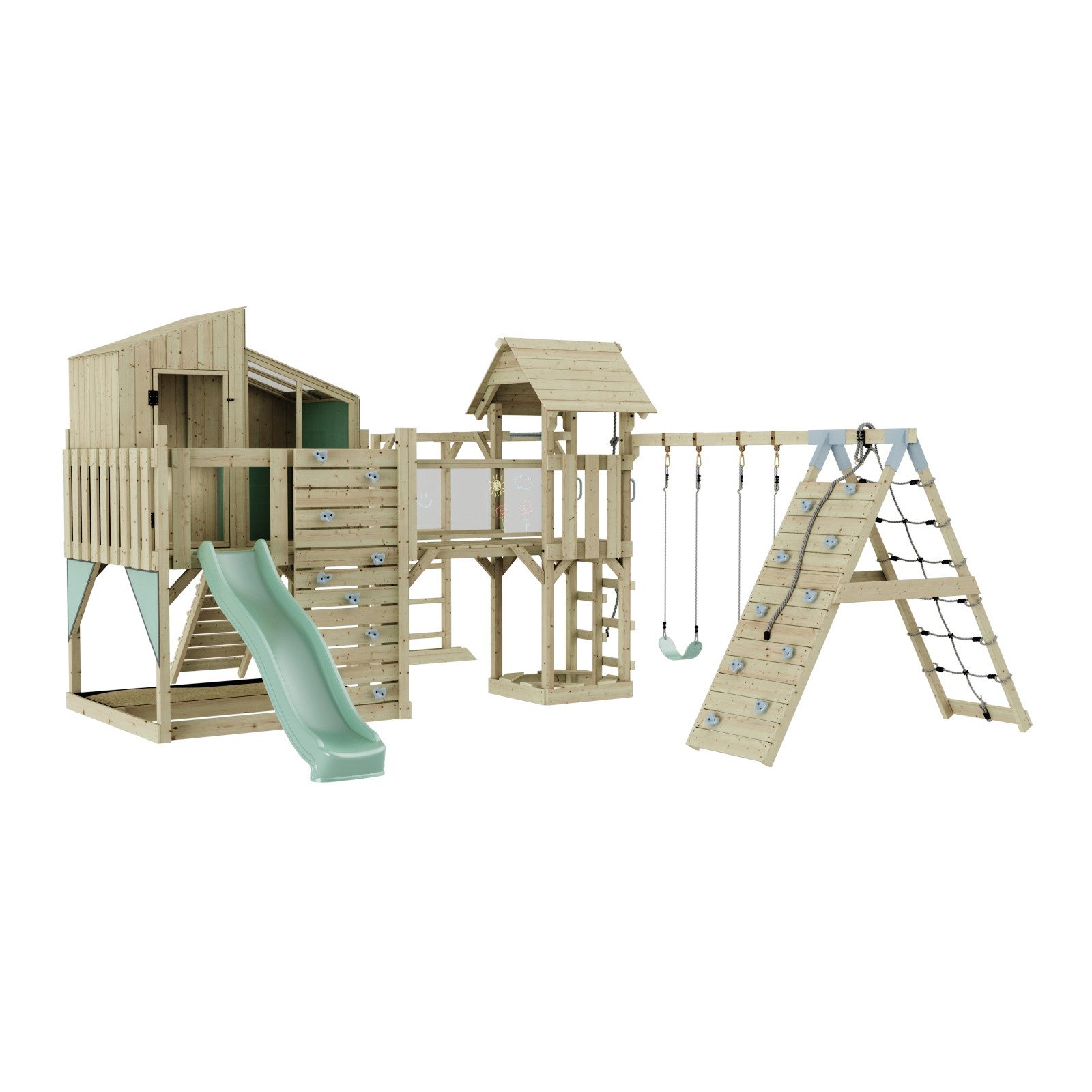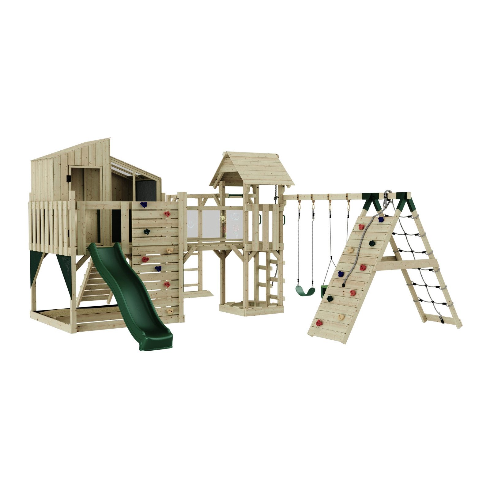 Tauche ein in das Abenteuerland des OutdoorToys Spielturm "Gustav"! dieser Allrounder im Garten zaubert nicht nur ein gemütliches Spielhaus, eine Schaukelnde Oase, eine Kletterwand und eine Rutschbahn ins Kinderherz, sondern bietet auch alles, was kleine Abenteurer sich nur wünschen können.