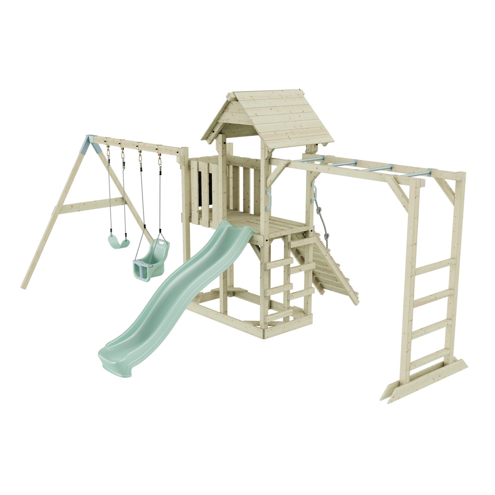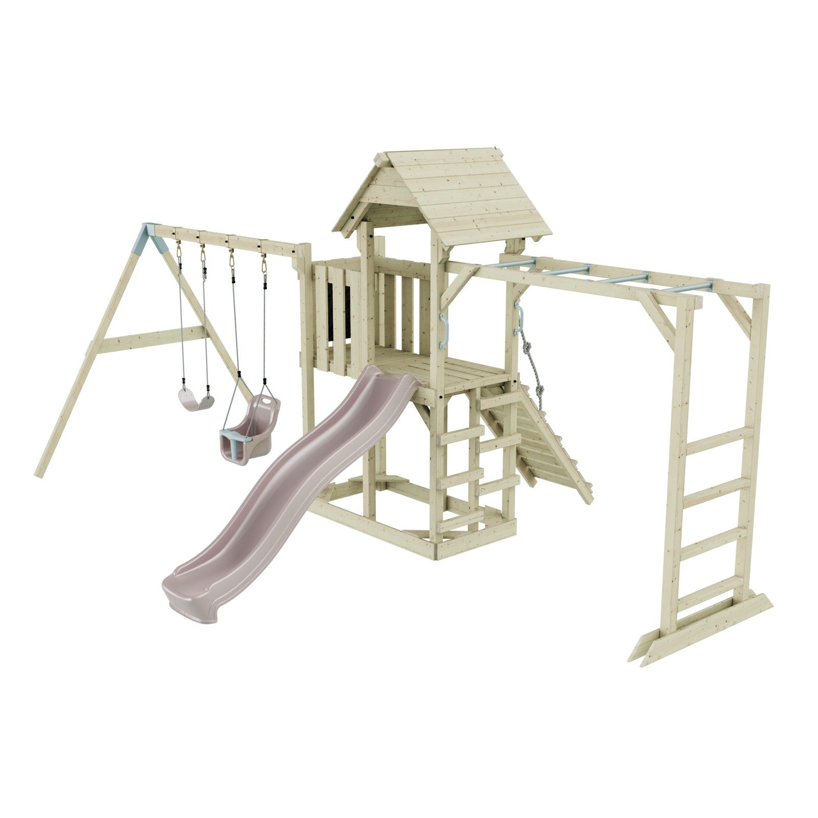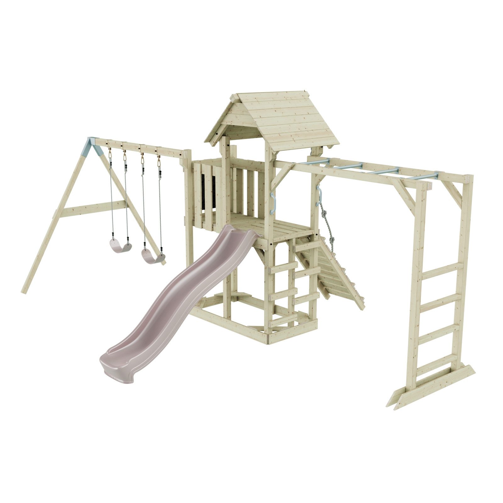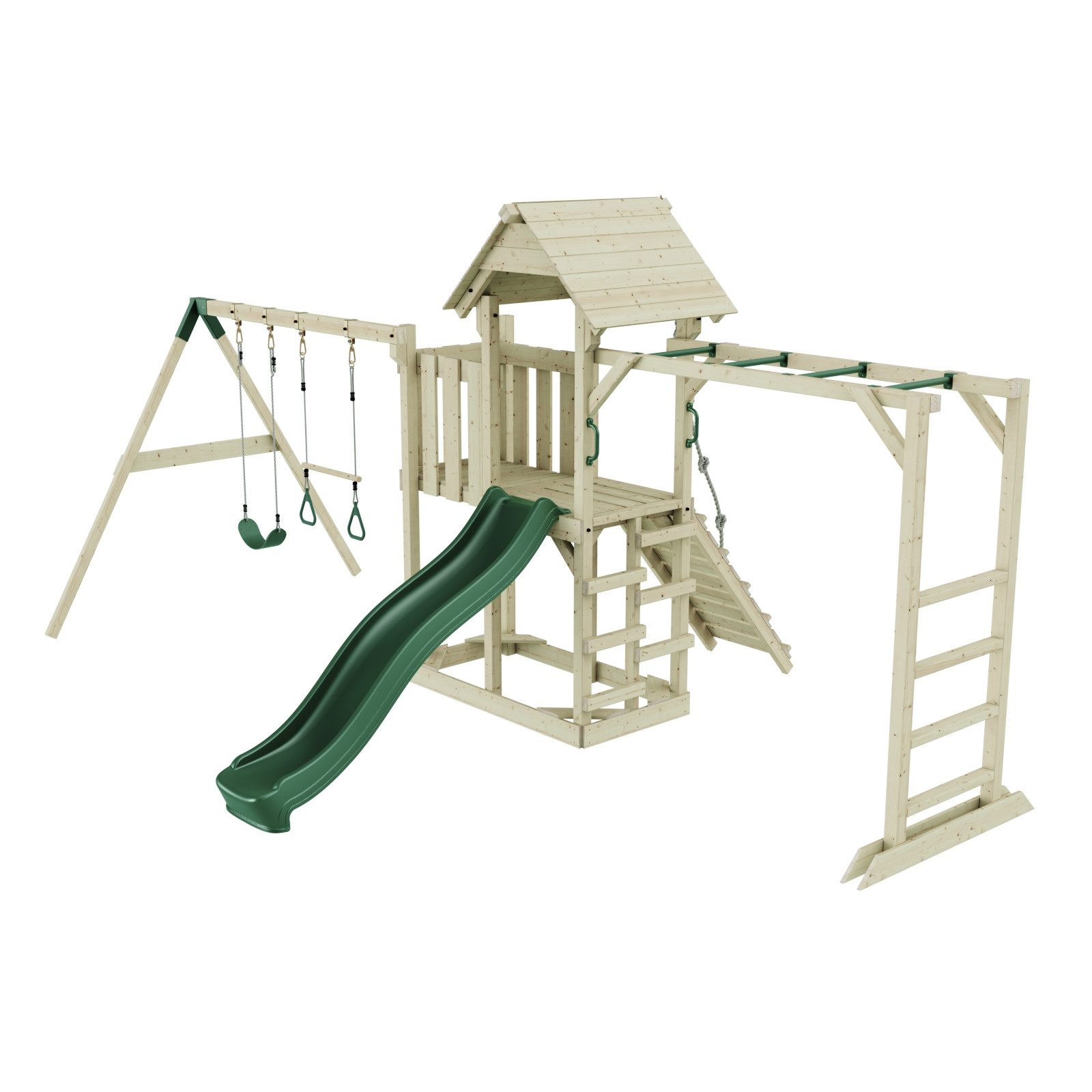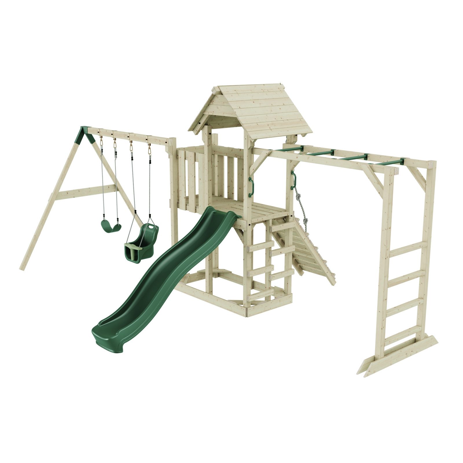 Willkommen in der faszinierenden Welt von OutdoorToys! Hier erwartet euch der Spielturm Helsingborg, bereit für die tollsten Abenteuer! Mit zwei Schaukeln, einer aufregenden Wellenrutsche und Hangelstangen zum Klettern bietet er euch und euren Geschwistern jede Menge unterhaltsame Action. Euer Garten wird zur ultimativen Spielzone!