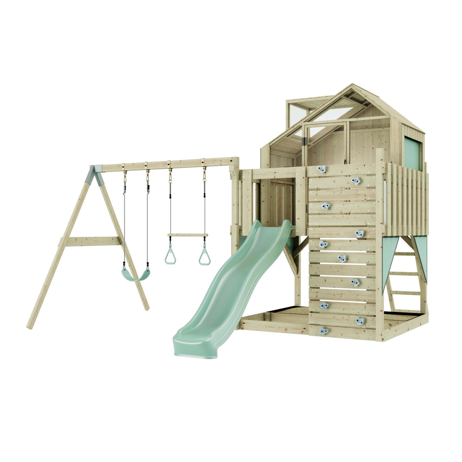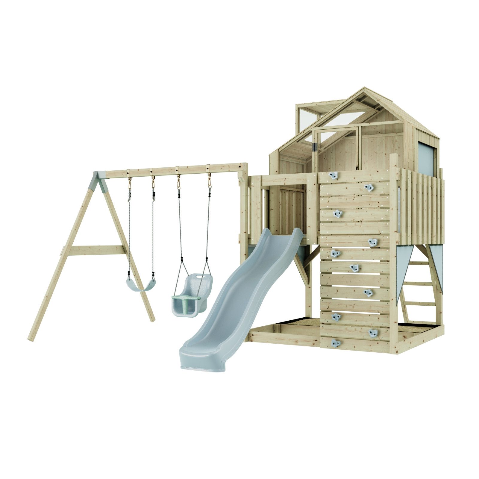 Описание товара (мы ещё работаем над переводом, извините за неудобство): Der Name Lasse bedeutet 'der Sieger' und wird das Herz eurer Kinder im Handumdrehen für sich gewinnen! Mit seinen vielseitigen Spielmöglichkeiten sorgt er für grenzenlosen Spielspaß. Ob hoch hinaus auf der Kletterwand, schwungvoll wieder nach unten über die Rutsche oder heimlich versteckt im Spielhaus, mit dem Spielturm Lasse wird es nie langweilig. Der Bereich unter dem Spielturm kann als Sandkasten genutzt werden. , Die Doppelschaukel lädt alle zum Schaukeln ein, denn sie kann mit einer normalen, Baby- oder Nestschaukel, bestellt werden. , Stabile Konstruktion aus unbehandeltem Holz , Einstellbare Schaukelhöhe , 10 Jahre Garantie auf Holzelemente , Viel Lichteinfall im Spielhaus Produktdetails: Pulverbeschichtete &, verzinkte Schaukelaufhängungen Sand ist nicht im Lieferumfang enthalten Maximales Gewicht: 50 kg pro Benutzer Длина: 399 ,cm Höhe: 291 ,cm Breite: 414 ,cm Farbe: Eisblau Im Lieferumfang enthalten: Spielhaus- und Plattformkonstruktion Fenster aus Acrylglas Leiter zur Plattform Bunte Klettersteine 2x Kinderschaukel 220 cm Wellenrutsche Sicherheitshinweise: Ab 3 Jahren geeignet Nur für den Privat-/Hausgebrauch geeignet Benutzung nur unter Aufsicht eines Erwachsenen Montagehinweis: Eine vollständige Montageanleitung ist im Lieferumfang enthalten. Das Holz des Artikels ist nicht vorgebohrt. Für die Montage brauchst du Werkzeuge, unter anderem eine Bohrmaschine. Wir empfehlen, das Holz mit der OutdoorToys Holzlasur zu imprägnieren, um es gegen Witterung und Schädlinge zu schützen. ,Zur Befestigung des Produkts werden Bodenanker benötigt, diese sind im Zubehör zu finden. Benutzungshinweis: Dieses Produkt wird aus unbehandeltem Holz hergestellt und kann Risse aufweisen. Diese sind normal und haben keinen Einfluss auf die Struktur, Stärke, Stabilität oder Haltbarkeit des Produkts. , , Die Outdoor Toys Holzlasur schützt unbehandeltes Holz auf nachhaltige Weise vor Witterung und Schädlingen nd macht es so länger haltbar. Unsere Lasur ist nach Norm EN 71-3 getestet und somit ideal für Kinderspielgeräte geeignet. Bitte beachte, dass die Imprägnierung vor dem Aufbau des Kinderspielgeräts erfolgen muss, um den maximalen Schutz zu erreichen. Die OutdoorToys Holzlasur kann als Zubehör erworben werden. , Dieser Artikel wurde gemäß der Spielzeugsicherheitsverordnung DIN EN 71 konzipiert und hergestellt. Die abgebildeten Farben und angegebenen Maße können minimal abweichen.