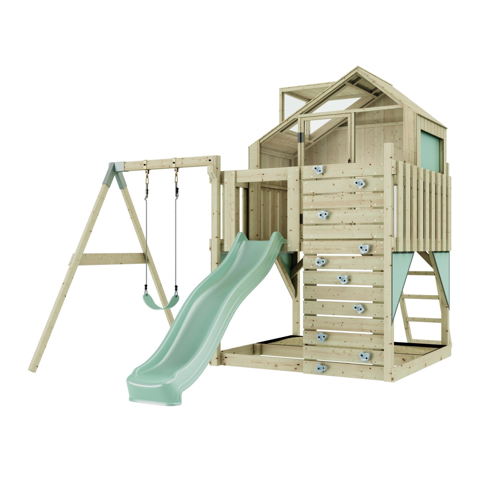 Описание товара (мы ещё работаем над переводом, извините за неудобство): Der Name Madita bedeutet 'die Perle' - und genau das könnte man auch zu unserem gleichnamigen Spielturm sagen! Über die Kletterwand gelangen die Kleinen auf die Plattform mit Spielhaus, von der sie eine tolle Aussicht haben. Mit ganz viel Schwung geht es über die Rutsche dann wieder nach unten. ,Ob mit einer normalen, Baby- oder Nestschaukel, auf der Schaukel kann sich der Nachwuchs durch die Lüfte schwingen, egal in welchem Alter. Der Bereich unter dem Spielturm kann als Sandkasten genutzt werden. , Stabile Konstruktion aus unbehandeltem Holz , Einstellbare Schaukelhöhe , 10 Jahre Garantie auf Holzelemente , Viel Lichteinfall im Spielhaus Produktdetails: Pulverbeschichtete &, verzinkte Schaukelaufhängungen Sand ist nicht im Lieferumfang enthalten Maximales Gewicht: 50 kg pro Benutzer Длина: 308 ,cm Höhe:291 ,cm Breite: 414 ,cm Farbe: Eisblau Im Lieferumfang enthalten: Spielhaus- und Plattformkonstruktion Fenster aus Acrylglas Leiter zur Plattform Bunte Klettersteine Kinderschaukel 220 cm Wellenrutsche Sicherheitshinweise: Ab 3 Jahren geeignet Nur für den Privat-/Hausgebrauch geeignet Benutzung nur unter Aufsicht eines Erwachsenen Montagehinweis: Eine vollständige Montageanleitung ist im Lieferumfang enthalten. Das Holz des Artikels ist nicht vorgebohrt. Für die Montage brauchst du Werkzeuge, unter anderem eine Bohrmaschine. Wir empfehlen, das Holz mit der OutdoorToys Holzlasur zu imprägnieren, um es gegen Witterung und Schädlinge zu schützen. ,Zur Befestigung des Produkts werden Bodenanker benötigt, diese sind im Zubehör zu finden. Benutzungshinweis: Dieses Produkt wird aus unbehandeltem Holz hergestellt und kann Risse aufweisen. Diese sind normal und haben keinen Einfluss auf die Struktur, Stärke, Stabilität oder Haltbarkeit des Produkts. , , Die Outdoor Toys Holzlasur schützt unbehandeltes Holz auf nachhaltige Weise vor Witterung und Schädlingen nd macht es so länger haltbar. Unsere Lasur ist nach Norm EN 71-3 getestet und somit ideal für Kinderspielgeräte geeignet. Bitte beachte, dass die Imprägnierung vor dem Aufbau des Kinderspielgeräts erfolgen muss, um den maximalen Schutz zu erreichen. Die OutdoorToys Holzlasur kann als Zubehör erworben werden. , Dieser Artikel wurde gemäß der Spielzeugsicherheitsverordnung DIN EN 71 konzipiert und hergestellt. Die abgebildeten Farben und angegebenen Maße können minimal abweichen.