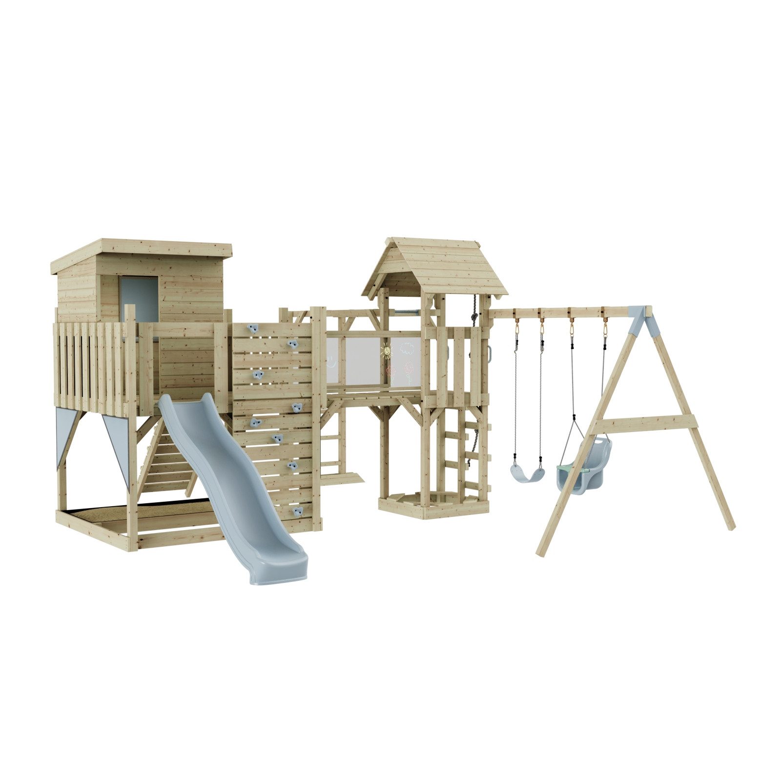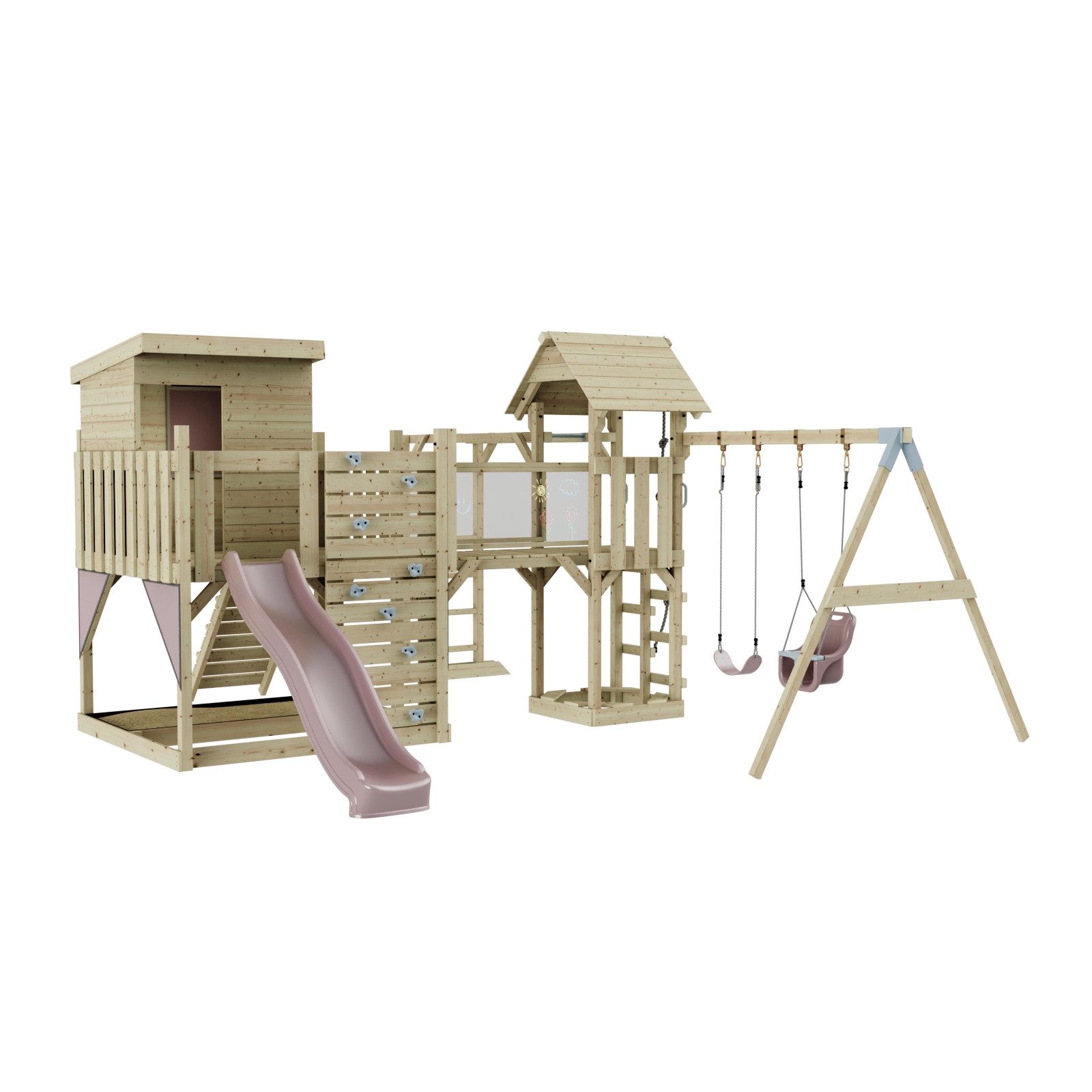 Willkommen zum Kinderspielturm „Malou“ – der Name „Malou“ bedeutet „die Mächtige“ und genau das spiegelt sich in diesem beeindruckenden Holzspielplatz wider. Mit Spielhäusern, Kletterwand, Rutsche und Brücke bietet „Malou“ unzählige Abenteuer für die Kleinen.