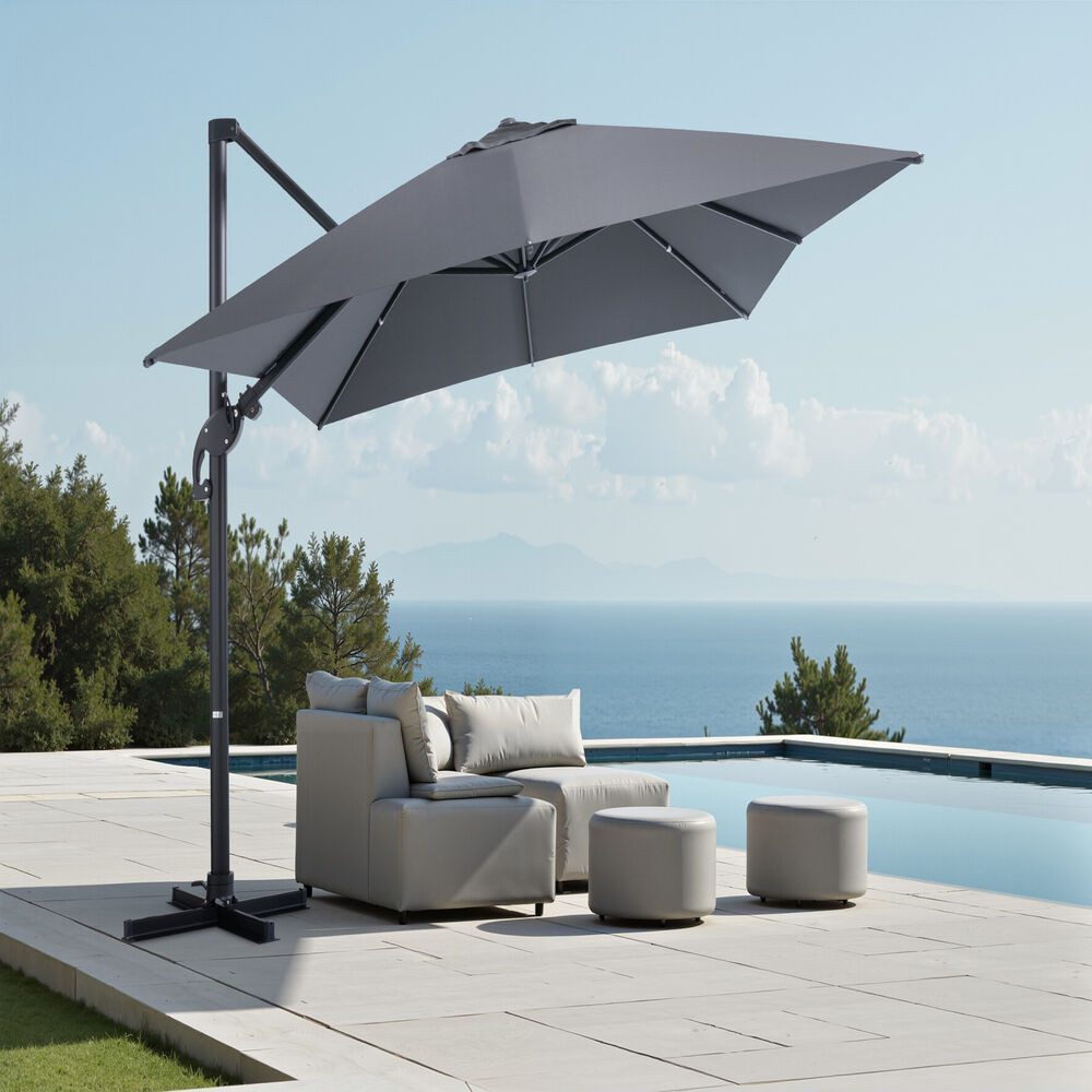 Artikelnummer: 34840 Moderner Ampelschirm von OUTFLEXX – Stilvoller Sonnenschutz für Ihren Garten Erleben Sie mit dem Ampelschirm von OUTFLEXX einen eleganten und funktionalen Sonnenschutz, der Ihren Außenbereich in eine Wohlfühloase verwandelt. Dieser hochwertige Schirm bietet nicht nur zuverlässigen Schutz vor Sonne, sondern überzeugt auch durch seine langlebigen Materialien, robuste Verarbeitung und zeitlose Ästhetik. Gefertigt aus stabilem Aluminium und einem strapazierfähigen Polyester-Dach (ca. 250g/m²), ist der Ampelschirm optimal auf die Anforderungen des Außenbereichs abgestimmt. Die Pulverbeschichtung des Gestells sorgt für zusätzlichen Schutz vor Rost und Kratzern, während das UV-beständige Material Sie und Ihre Liebsten vor schädlicher Sonneneinstrahlung schützt. Mit einer großzügigen Schirmfläche von ca. 3 x 4 m spendet der Schirm ausreichend Schatten für gesellige Momente im Garten, auf der Terrasse oder am Pool. Das innovative Air-Vent-System garantiert eine optimale Luftzirkulation unter dem Schirm und sorgt auch an windigen Tagen für mehr Stabilität. Dank der robusten Konstruktion und einer Durchgangshöhe von ca. 210 cm ist der Ampelschirm ideal für die tägliche Nutzung geeignet. Mit einer Schirmhöhe von ca. 255 cm und einem massiven Schirmstockdurchmesser von ca. 90 x 60 x 2,0 mm überzeugt er durch Standfestigkeit und Stabilität. Die quadratische Form und das moderne, graue Design machen diesen Schirm zu einem optischen Highlight, das sich harmonisch in jede Gartengestaltung einfügt. Seine schmutzabweisenden und pflegeleichten Materialien erleichtern die Reinigung und sorgen dafür, dass der Schirm auch nach längerer Nutzung wie neu aussieht. Ob für ein gemütliches Frühstück im Freien oder als Schutz vor intensiver Mittagssonne – dieser Ampelschirm vereint Funktionalität und Ästhetik auf höchstem Niveau.