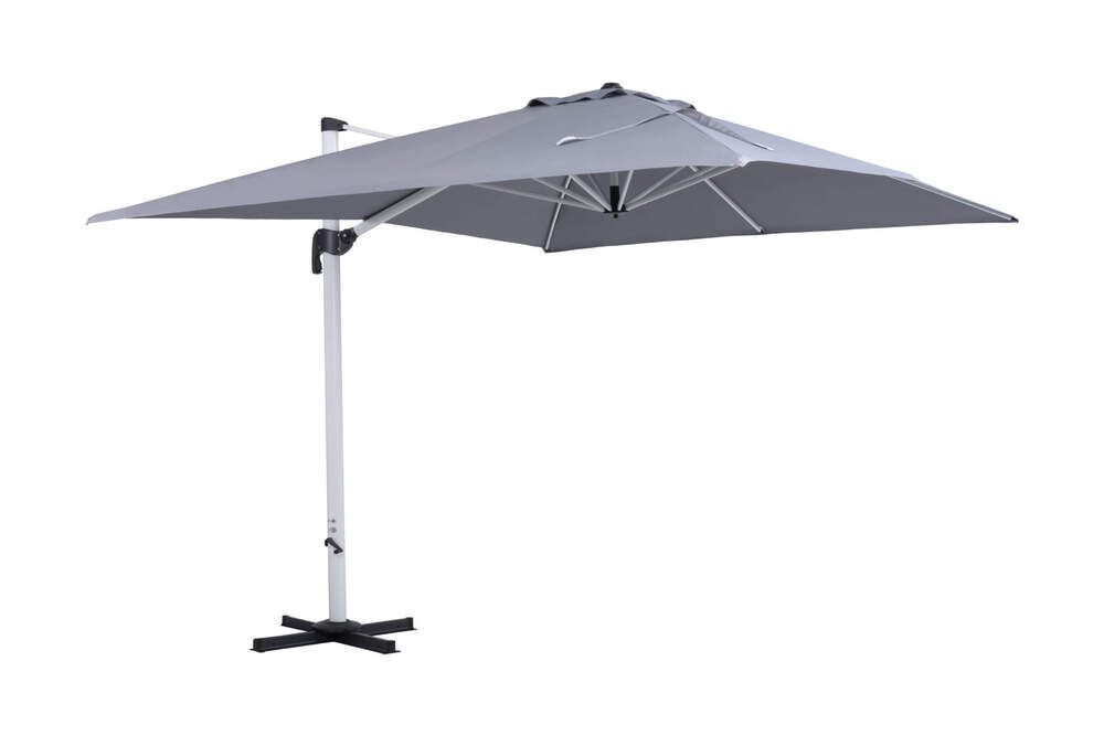 Artikelnummer: 34681 Ampelschirm Roma von OUTFLEXX – Eleganz und Funktionalität für Ihren Garten Der Ampelschirm Roma von OUTFLEXX ist die perfekte Wahl für all diejenigen, die stilvolle Eleganz und praktische Funktionalität im Außenbereich vereinen möchten. Mit seiner großzügigen Fläche von ca. 3 x 4 m bietet dieser Schirm angenehmen Schatten an heißen Sommertagen und verwandelt Ihren Garten, Ihre Terrasse oder Ihren Balkon in eine Wohlfühloase. Das zeitlose Design in der Farbe Weiß harmoniert mit jedem Outdoor-Stil und verleiht Ihrem Außenbereich ein modernes Flair. Gefertigt aus hochwertigen Materialien wie Aluminium und 250 g/m² starkem Polyester, überzeugt der Ampelschirm durch seine robuste Bauweise und Langlebigkeit. Das pulverbeschichtete Aluminiumgestell ist korrosionsbeständig und sorgt für eine stabile und sichere Standfestigkeit. Der strapazierfähige Polyesterbezug ist nicht nur wasserabweisend, sondern auch UV-beständig (UV80+), sodass Sie optimal vor Sonneneinstrahlung geschützt sind. Zudem sorgt die PA-Beschichtung des Schirmtuchs in grau für zusätzlichen Schutz gegen Witterungseinflüsse. Ein besonderes Highlight des Ampelschirms Roma ist das integrierte Air-Vent System, das eine optimale Luftzirkulation ermöglicht und die Standfestigkeit bei leichten Windverhältnissen erhöht. Die praktische Kurbelfunktion ermöglicht ein müheloses Öffnen und Спрятать des Schirms, sodass Sie ihn jederzeit einfach bedienen können. Mit einer Durchgangshöhe von ca. 210 cm bietet der Schirm ausreichend Platz, sodass auch größere Personen bequem darunter hindurchgehen können. Das innovative Design und die hochwertigen Materialien machen diesen Ampelschirm nicht nur zu einem praktischen Begleiter an sonnigen Tagen, sondern auch zu einem stilvollen Eyecatcher in Ihrem Außenbereich. Die Maße des Schirms betragen ca. 300 cm in der Длина, ca. 400 cm in der Breite und ca.