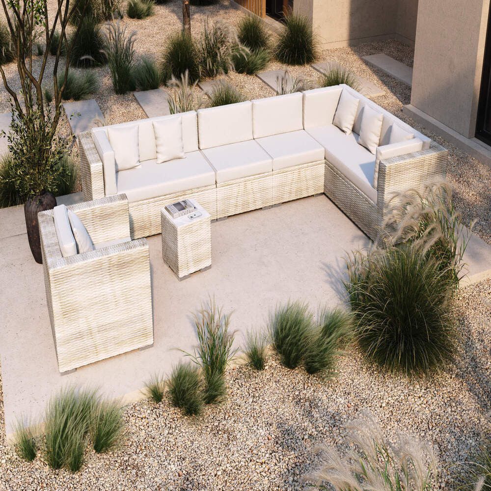 Artikelnummer: 80329 OUTFLEXX Gartenlounge-Set, desert-beige, Polyrattan/Aluminium, komfortable Polster, mit Kissenboxfunktion Erleben Sie pure Entspannung mit dem exklusiven OUTFLEXX Gartenlounge-Set. Dieses hochwertige Lounge-Set vereint modernes Design, erstklassige Materialien und durchdachte Funktionalität, um Ihren Außenbereich in eine stilvolle Wohlfühloase zu verwandeln. Mit seiner eleganten Farbgebung in desert-beige sowie der robusten Verarbeitung aus Polyrattan, Aluminium und Polyester ist dieses Set nicht nur ein Blickfang, sondern auch langlebig und wetterbeständig. Das Set besteht aus einem großzügigen 3-Sitzer Gartensofa (ca. 209 x 84 cm), einem komfortablen 2-Sitzer Gartensofa, zwei praktischen Mittelelementen, einem Sessel sowie einem kompakten Beistelltisch. Diese vielseitige Zusammenstellung ermöglicht eine flexible Gestaltung nach Ihren individuellen Bedürfnissen – sei es für gesellige Runden mit Freunden oder entspannte Stunden im Freien. Höchster Sitzkomfort für entspannte Stunden Dank der bequemen Polster mit abnehmbaren und waschbaren Bezügen genießen Sie maximalen Sitzkomfort. Die weichen Kissen sorgen für ein angenehmes Sitzerlebnis, während die strapazierfähigen Bezüge leicht gereinigt werden können. Der integrierte Reißverschluss ermöglicht ein einfaches Abnehmen der Bezüge. Robust und wetterfest – ideal für den Außenbereich Das hochwertige Polyrattan in Kombination mit einem stabilen Aluminiumgestell macht dieses Lounge-Set besonders widerstandsfähig gegen Witterungseinflüsse. Es ist UV-beständig, rostfrei und pflegeleicht, sodass Sie es das ganze Jahr über im Freien nutzen können. Flexibles und modulares Design Die einzelnen Module lassen sich nach Belieben anordnen, sodass Sie Ihre Lounge ganz individuell gestalten können. Ob als große Ecklounge oder separate Sitzmöglichkeiten – mit diesem Set bleiben Sie flexibel.