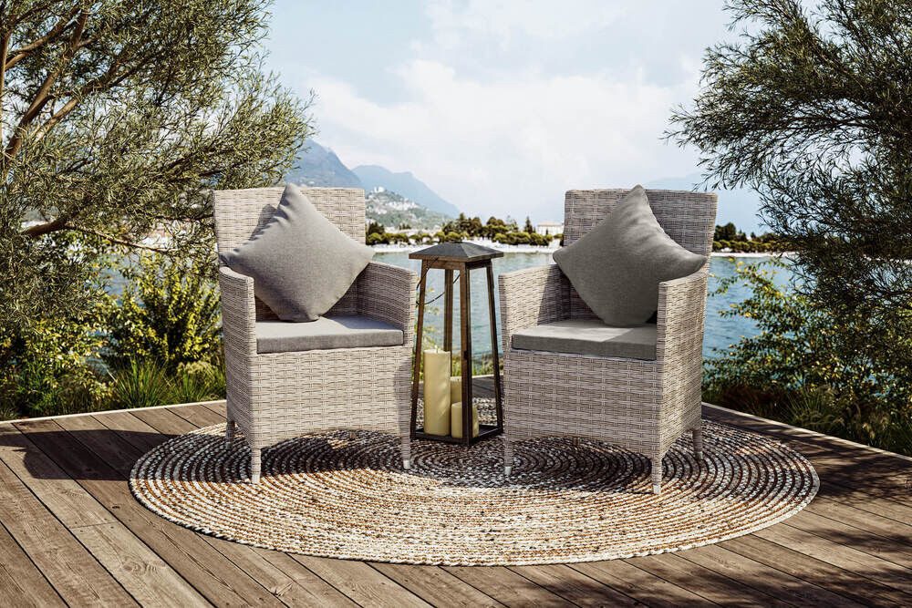Artikelnummer: 34938OUTFLEXX Sessel, desert-beige, Polyrattan/Aluminium, ca. 60 x 60 x 86 cm, hohe Belastbarkeit, abnehmbare Bezüge, mit Reißverschluss, 2er SetErleben Sie das ganze Jahr über Komfort und Entspannung mit diesem formschönen 2er Set OUTFLEXX Sessel. Die stilvollen Gartensessel aus robustem Polyrattan-Geflecht auf einem leichten Aluminiumgestell verwandeln jeden Außenbereich in eine einladende Wohlfühloase. Ob auf Ihrer Terrasse, in Ihrem Wintergarten oder auf dem Balkon – diese hochwertigen Sitzmöbel überzeugen durch ihre zeitlose Eleganz und hervorragende Verarbeitung.Dank der sorgfältig gewählten Materialien sind die Sessel besonders wetterfest und UV-beständig. Polyrattan zeichnet sich durch eine strapazierfähige Struktur aus, die auch bei intensiver Sonneneinstrahlung nicht verblasst oder brüchig wird. Das Aluminiumgestell überzeugt durch Korrosionsbeständigkeit und hohe Stabilität, sodass Sie sich rundum sicher fühlen können. Die ca. 60 x 60 x 86 cm großen Sessel bieten ausreichend Raum für bequemes Sitzen und gemütliche Auszeiten im Freien. So genießen Sie erholsame Momente, ohne sich über aufwendige Pflege oder anfälliges Material Gedanken machen zu müssen.Für zusätzlichen Sitzkomfort sorgt das ca. 5 cm dicke Sitzkissen in der dezenten Farbe desert-beige. Das angenehm weiche Polster, aus 100 % Polyester (ca. 240 g/m²), verleiht den Sesseln eine luxuriöse Note und lädt zum längeren Verweilen ein. Gleichzeitig sind die Bezüge abnehmbar, waschbar bei ca. 30 °C und mit einem praktischen Reißverschluss versehen. So lässt sich das Kissen im Handumdrehen reinigen und bleibt dauerhaft frisch und gepflegt. Auch Pollen, Staub oder kleine Missgeschicke lassen sich dadurch mühelos beseitigen.Ein großes Plus ist die bereits montierte Anlieferung: Einfach auspacken und sofort in herrliche Stunden der Entspannung starten.