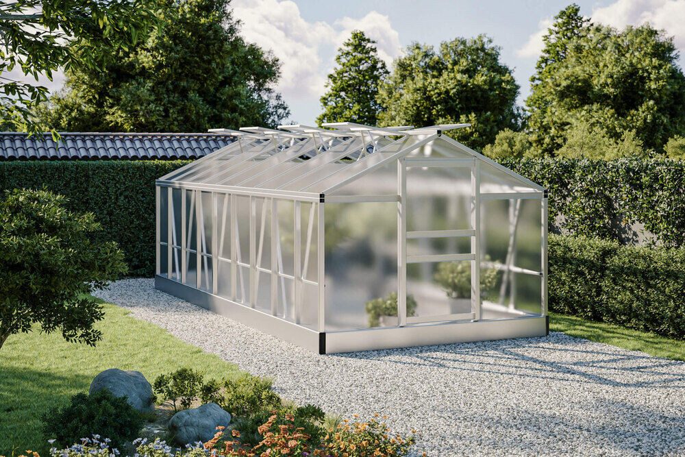 Artikelnummer: 80153 Robustes und witterungsbeständiges Gewächshaus aus Aluminium für optimale Pflanzenzucht Erleben Sie die perfekte Kombination aus Funktionalität und Langlebigkeit mit dem OUTFLEXX Flora Gewächshaus. Dieses hochwertige Gewächshaus in der edlen Farbe Silber bietet ambitionierten Gärtnern und Gartenliebhabern die ideale Umgebung, um Pflanzen das ganze Jahr über zu kultivieren. Mit einer großzügigen Fläche von ca. 13,75 m² bietet es ausreichend Platz für unterschiedlichste Pflanzenarten, vom zarten Setzling bis hin zu ausgewachsenen Gemüsesorten. Das ca. 550 x 250 x 210 cm große Gewächshaus überzeugt nicht nur durch sein geräumiges Design, sondern auch durch seine robuste Konstruktion aus hochwertigem Aluminium. Dieses Material ist nicht nur besonders leicht, sondern auch korrosionsbeständig und witterungsbeständig – perfekt für den dauerhaften Einsatz im Freien. Die klare Verglasung sorgt für optimale Lichtverhältnisse im Inneren und unterstützt ein gesundes Pflanzenwachstum. Das Spitzdach des Gewächshauses bietet nicht nur eine ansprechende Optik, sondern auch funktionale Vorteile: Regenwasser wird effizient abgeleitet, sodass das Dach auch bei schlechter Witterung bestens geschützt bleibt. Die stabile Konstruktion und die hohe Belastbarkeit machen dieses Gewächshaus zu einem verlässlichen Partner für Ihre Gartenprojekte. Ein weiteres Highlight ist die einfache Montage. Dank durchdachter Bauweise und präzise vorgefertigter Bauteile kann das Gewächshaus mit geringem Montageaufwand aufgebaut werden. So bleibt mehr Zeit für die eigentliche Gartenarbeit und die Pflege Ihrer Pflanzen. Die großzügigen Maße bieten Ihnen zudem die Flexibilität, Regale oder Tische im Inneren zu integrieren und den Raum nach Ihren Wünschen zu gestalten. Mit seinen frostbeständigen und witterungsbeständigen Eigenschaften ist das OUTFLEXX Flora Gewächshaus ideal für die Nutzung in allen Jahreszeiten.