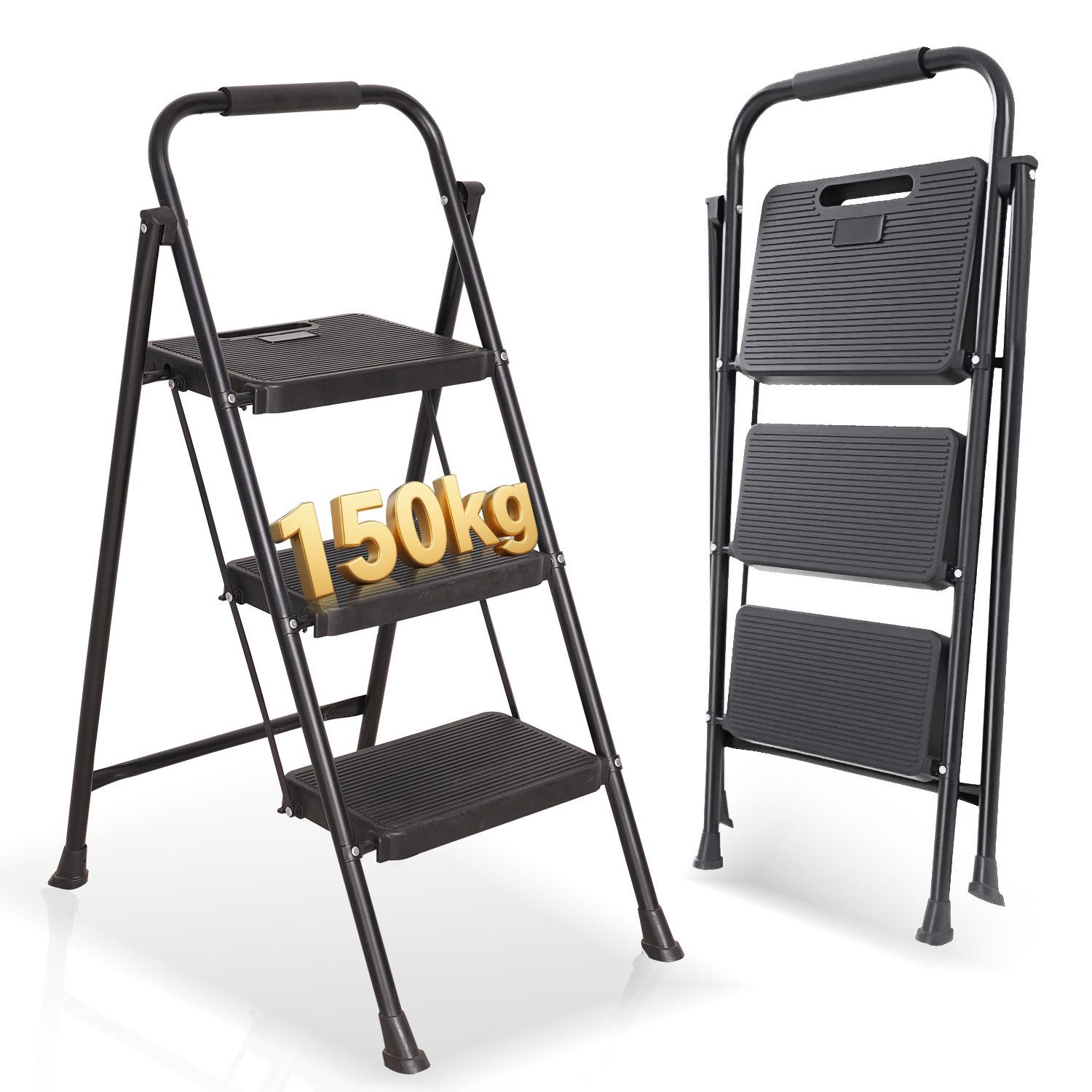 Die robuste Stahlkonstruktion mit einer maximalen Belastbarkeit von 150 kg reicht bis zum Fuß der Leiter, und eine Sicherheitsmetallspange unter der ersten Stufe arretiert die Leiter, so dass diese 3-stufige Stufenleiter zuverlässig, verlässlich und sicher im Gebrauch ist.