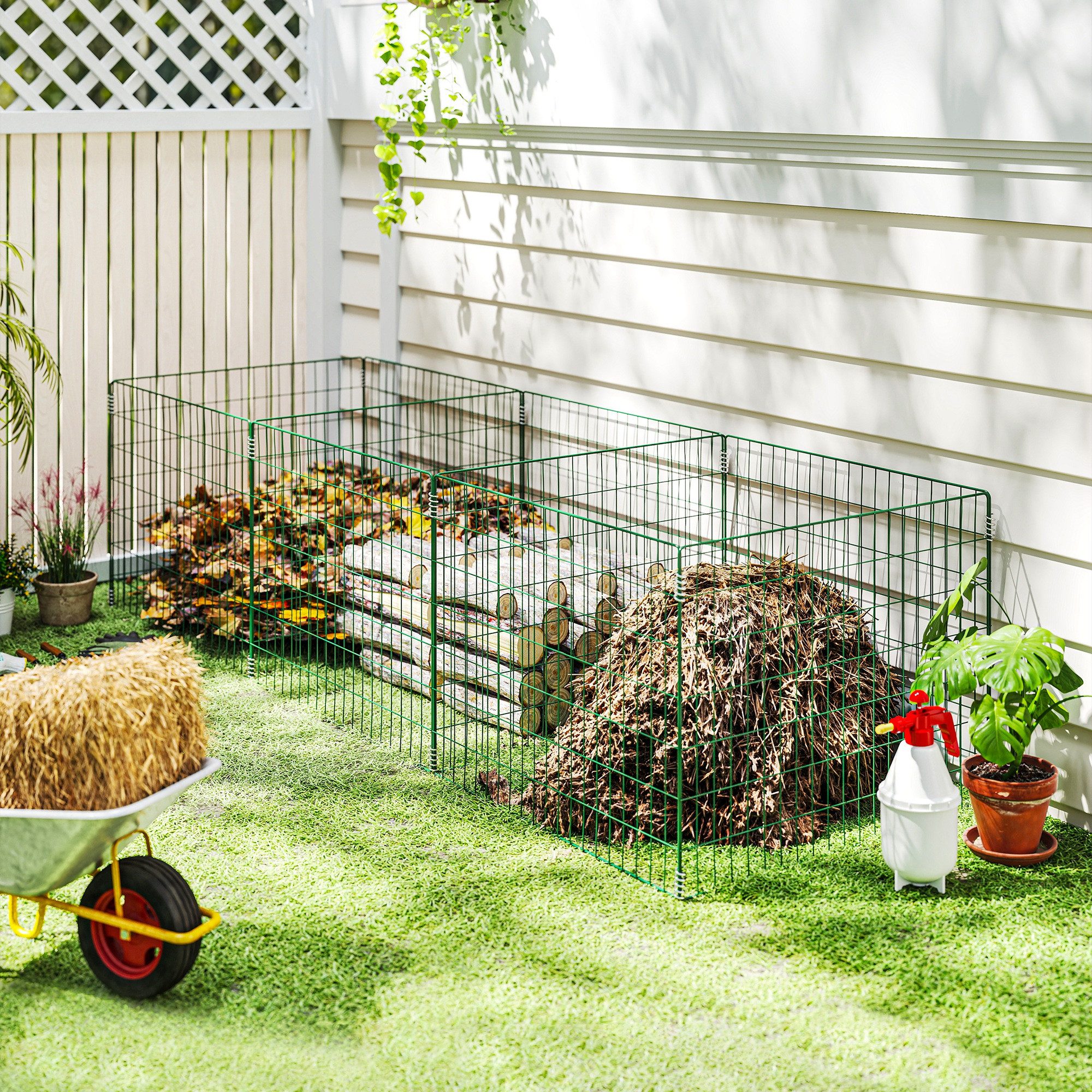 ● Das offene Gitterdesign des Gartenkomposters fördert die Luftzirkulation und verbessert die Bedingungen für die Kompostierung ● Das Design ohne Deckel erleichtert das schnelle und einfache Hinzufügen von Abfällen ● Großer Raum des Gartenkomposters mit 270L x 90B cm, unterteilt in drei Bereiche, steigert die Kompostierungskapazität ● Die lackierte Stahlkonstruktion des Komposters ist rostbeständig und widersteht rauen Wetterbedingungen ● Einfache Montage, anpassbare Formen wie rechteckig oder L-förmig für Flexibilität