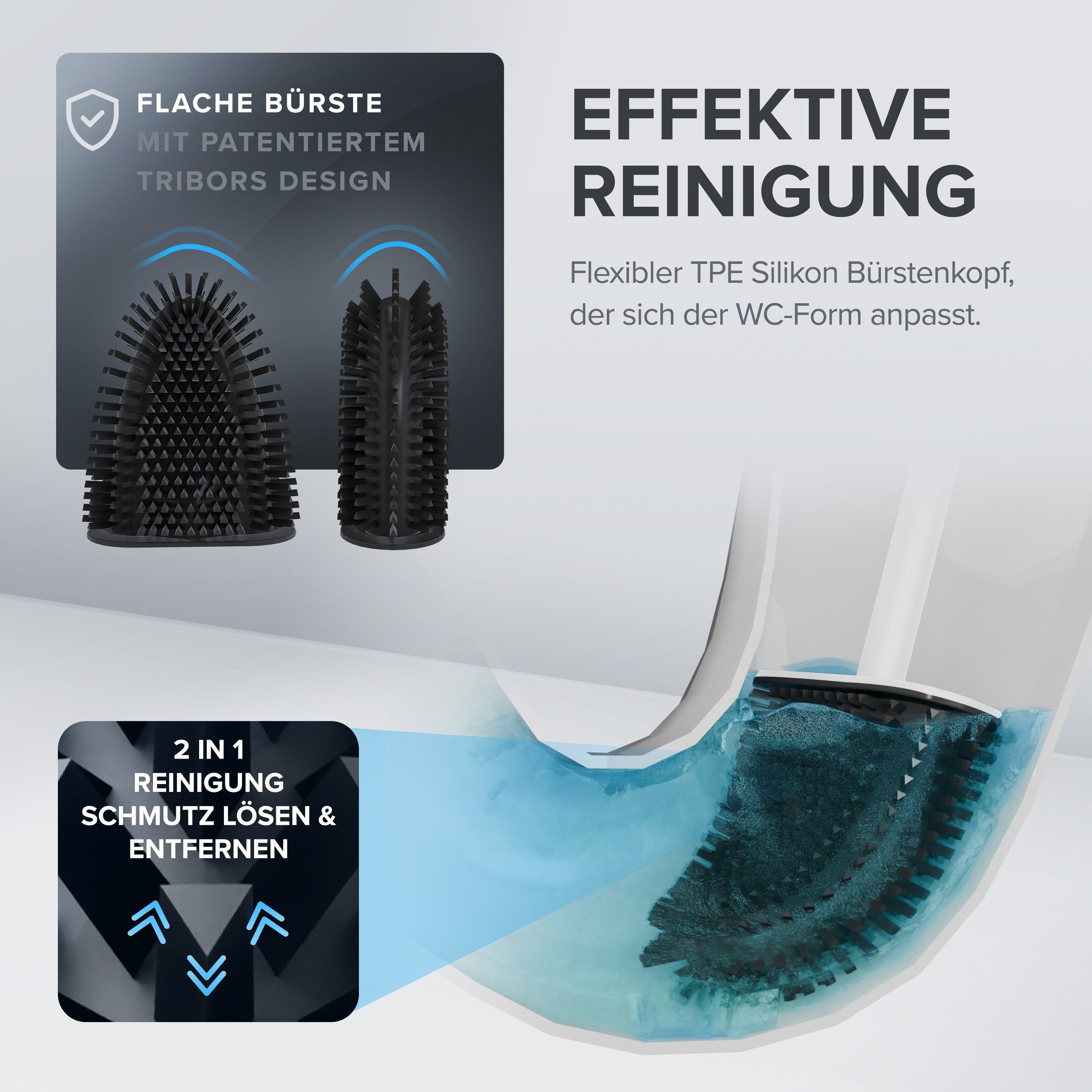 Hygienisch: Dank des extra für den Einsatz von WC Bürstenköpfen entwickelten TPE Silikon Materials haftet nichts an dem Bürstenkopf. Das Silikon ist flexibel und recyclebar
