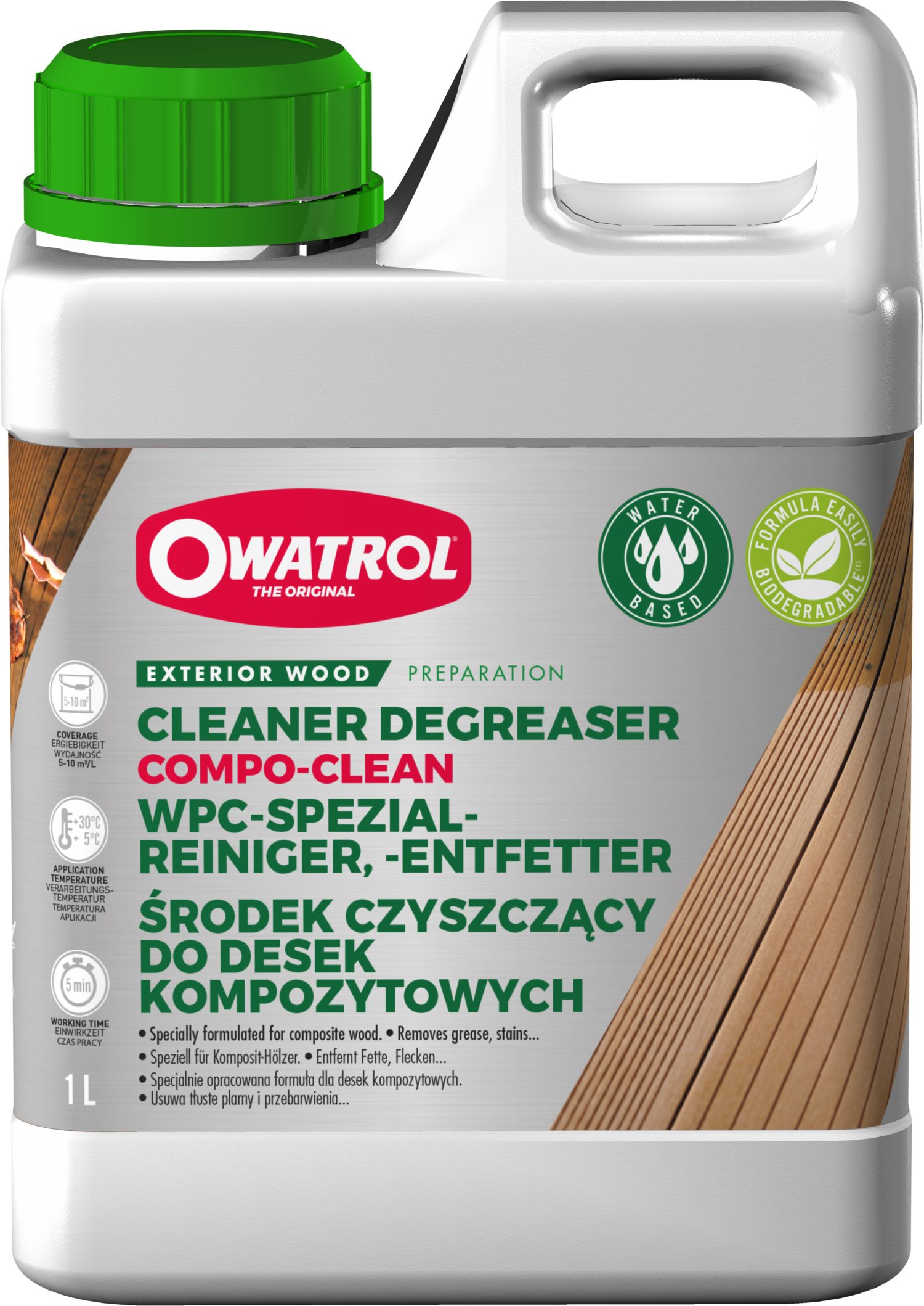 OWATROL COMPO CLEAN reinigt und entfettet WPC Belag Wasserbasiert, tiefenwirksam und gezielt für WPC entwickelt: OWATROL COMPO CLEAN ist der ideale Reiniger für jegliche Art von Verschmutzung auf WPC-Belägen. Dabei ist COMPO CLEAN schnell aufgetragen, hat innerhalb von 5 Minuten seine reinigende Wirkung erzielt und kann anschließend einfach mit Wasser und Bürste oder einem Hochdruckreiniger (max. 50 bar) abgewaschen werden. Durch seine Gel-artige Konsistenz wirkt COMPO CLEAN auch an vertikalen Flächen ohne Probleme. COMPO CLEAN kann auf WPC sowohl innen als auch außen angewendet werden und ist besonders geeignet für die Anwendung im kompletten Außenbereich, bspw. für Terrassen, Gartenmöbel, Zäune oder Stege. Die Anwendung ist dabei unbedenklich, da COMPO CLEAN natürlich abbaubar ist und angrenzende Materialien wie Kunststoffe, Poolfolien, Stein oder Glas nicht angreift. Trotzdem sollten umliegende Flächen zur Sicherheit abgedeckt werden, um eventuelle Flecken zu vermeiden.
