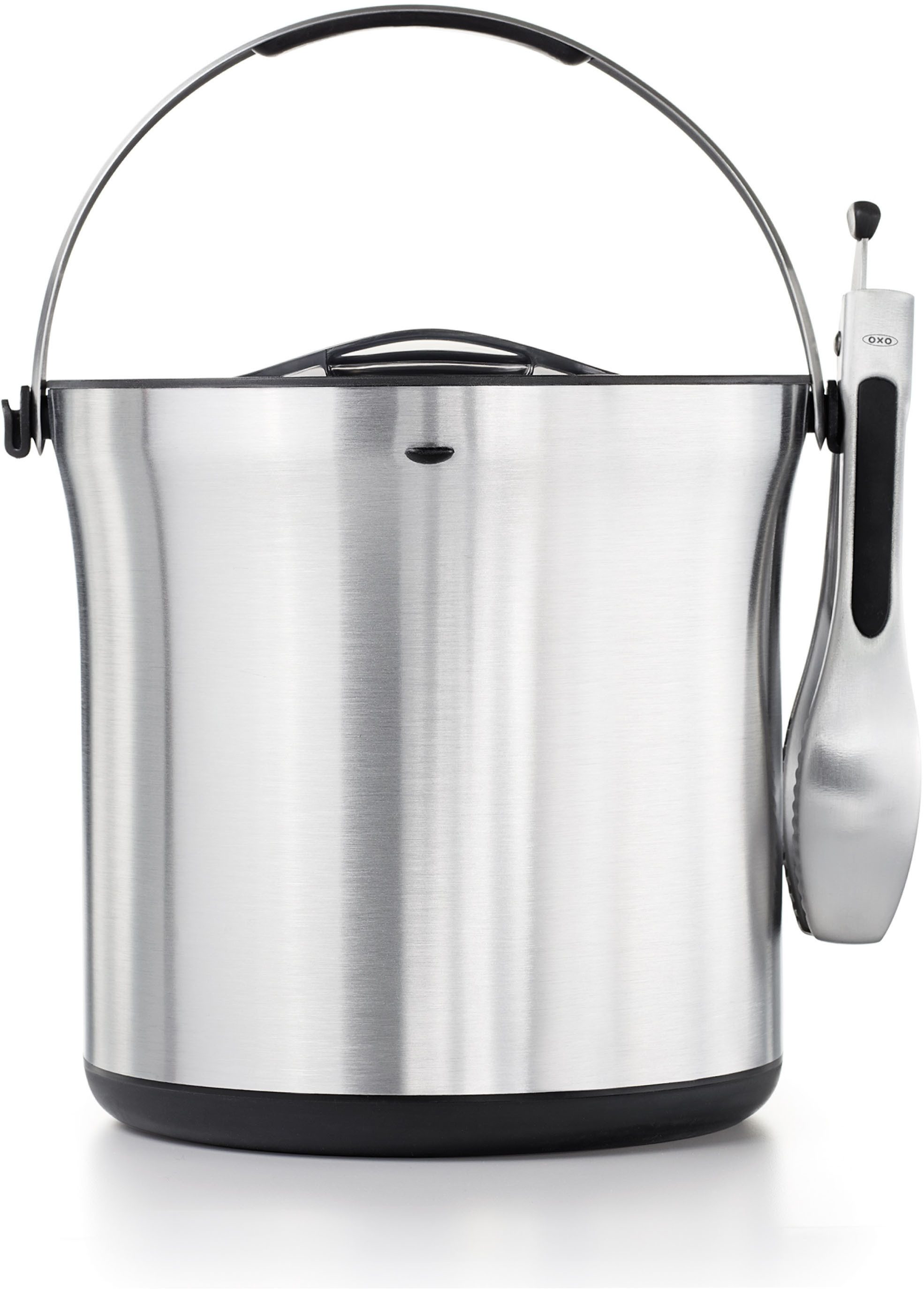 Ob Sie eisgekühlte Limonade oder edle Cocktails servieren – frische Eiswürfel gehören dazu. Halten Sie sie bereit mit dem OXO Stahl-Eiskübel mit Zange. Der Kübel hat eine Doppelwandkonstruktion, damit alles in seinem Inneren schön kalt bleibt und sich an der Außenseite kein Beschlag bildet. Er hat außerdem tiefe Kanäle an der Unterseite, um noch ganze Eiswürfel von eventuellem Schmelzwasser fern zu halten. Der durchsichtige Klappdeckel sorgt für einhändigen Zugang und sicheren Verschluss, und eine rutschfeste Standfläche hält den Kübel sicher an seinem Platz. Zum Set gehört auch eine Zange, die zum praktischen Servieren an den Seiten des Kübels befestigt wird und scharfe Zähne hat, um Eiswürfel leicht aufnehmen zu können.