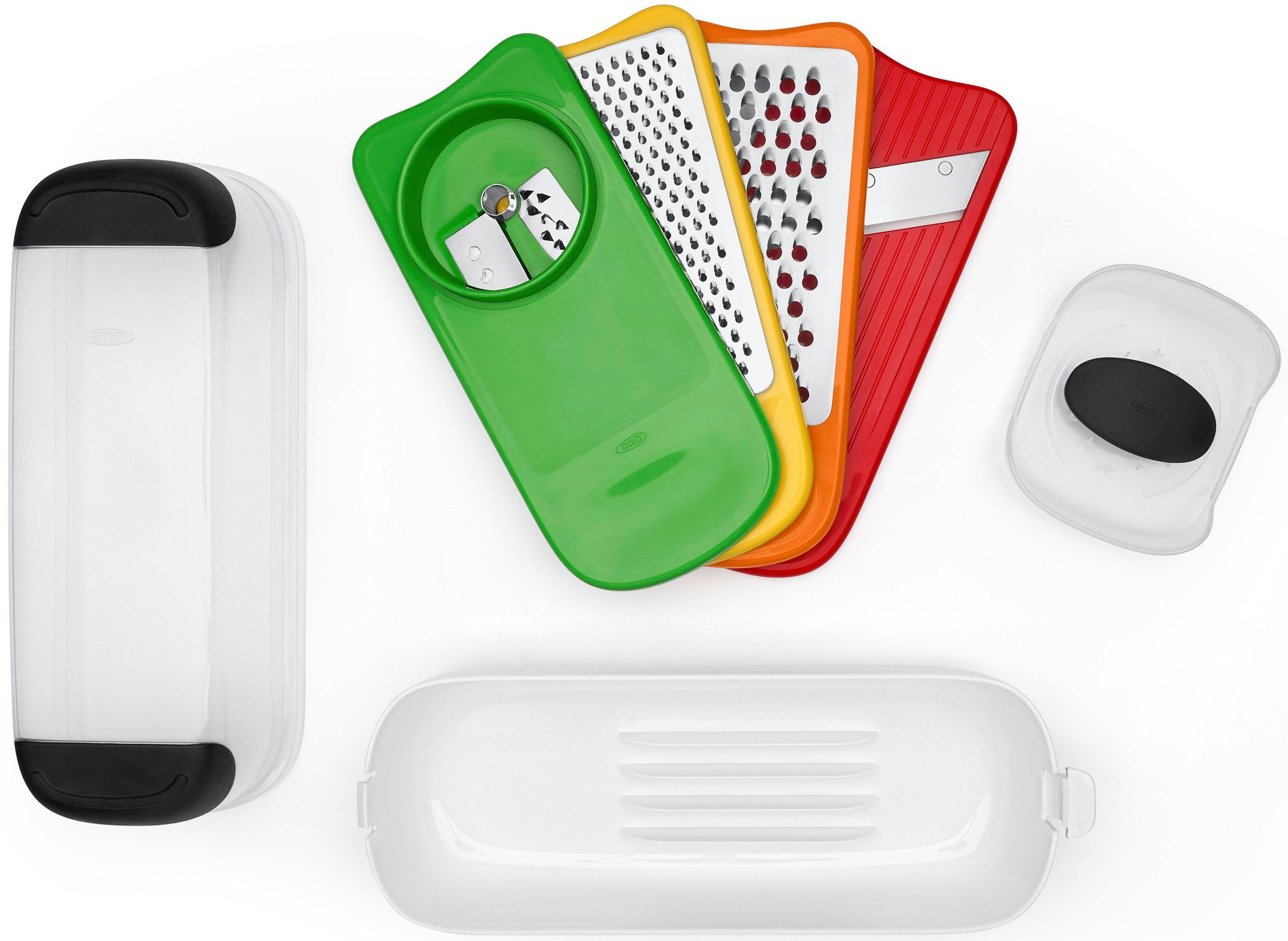 VIELSEITIG: Das praktische OXO Good Grips® Set ist ein unverzichtbarer Küchenhelfer und beinhaltet eine grobe Reibe, eine mittelfeine Reibe, einen Hobel und einen Spiralschneider.