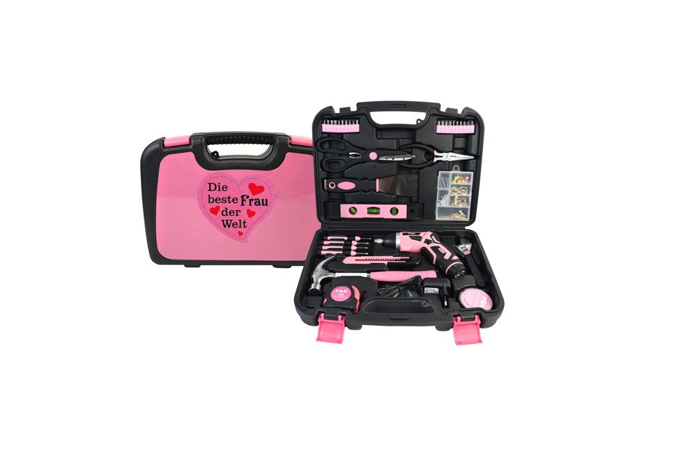 Dieses 136-teilige Werkzeugkoffer-Set ist das perfekte Geschenk für die beste Frau der Welt. Egal, ob für kleine Reparaturen im Haushalt oder kreative Projekte – dieses umfassende Set bietet alles, was man benötigt. Der robuste Koffer in stilvollem Design hält alle Werkzeuge ordentlich organisiert und griffbereit. Mit einer liebevollen, personalisierten Gravur auf dem Koffer ist dieses Set nicht nur praktisch, sondern auch ein besonderes Symbol der Wertschätzung. Ideal für Frauen, die gerne selbst Hand anlegen und immer gut ausgestattet sein wollen. Das 136-teilige Werkzeugset in Pink beinhaltet: Tool 1 x Akkuschraubendreher; 1 x Ladegerät; 1 x Hammer; 1 x Schere; 1 x Zange; 1 x 3,0 Meter Maßband; 1 x Cuttermesser; 4 x Feinmechaniker Schraubendreher; 4 x Schlitz - Bits; 6 x Kreuz Bits; 6 x Torx - Bits; 4 x Bitsset; 1 x Wasserwaage; 1 x "Engländer"; 1 x Isolierband; Set Nägel / Schrauben / Pins 1x “Die beste Frau der Welt „Schild im Herzform EAR Registrierungsnummer: WEEE-Reg.-Nr.DE81463053 Batt-Reg-Nr.DE30473506