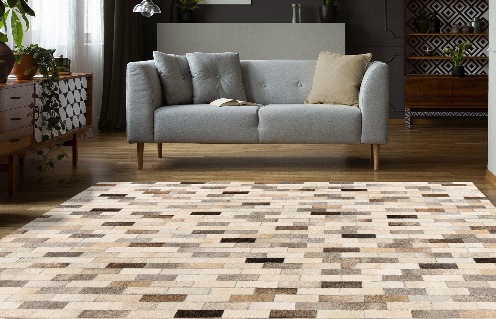 **Mit diesem vespieltem Unikat wird jede Wohnung zum Hit** Der handgefertigte Teppich ist besonders hochwertig und ist ein wahres Unikat. Er besteht zu 100% aus Rindleder, wobei die Unterseite aus 100% Wolle besteht und den Teppich besonders warm und angenehm macht. Das hochwertig verarbeitete Unikat ist ein wahrer Blickfänger in jedem Raum! Spezifikationen: • erhältliche Farben: Schwarz / Grau • Florhöhe: ca. 8mm • Material: 100% Rindleder, Rücken 100% Wolle • Größe: 80cm x 150cm / 120cm x 170cm / 160cm x 230cm