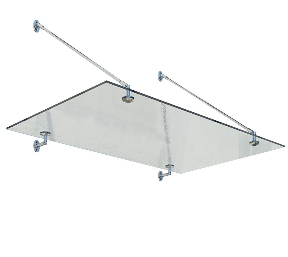 Extrem stabiles Vordach in ansprechendem Design. Massive Konstruktion aus Edelstahl. Nie wieder streichen, kein Rost, kein Verwittern. Die 12 mm starken, kristallklaren, 100%-UV beständigen Glasplatten sorgen für einen hohen Lichteinfall.