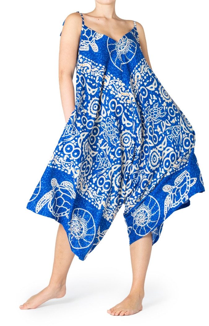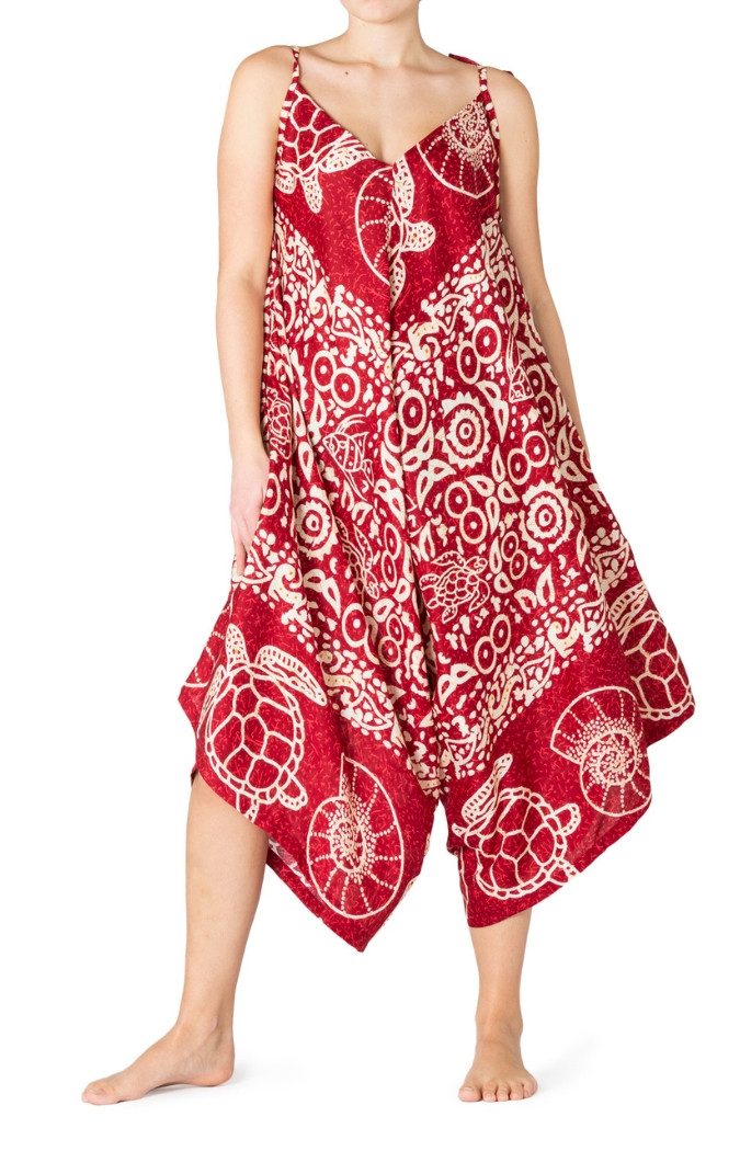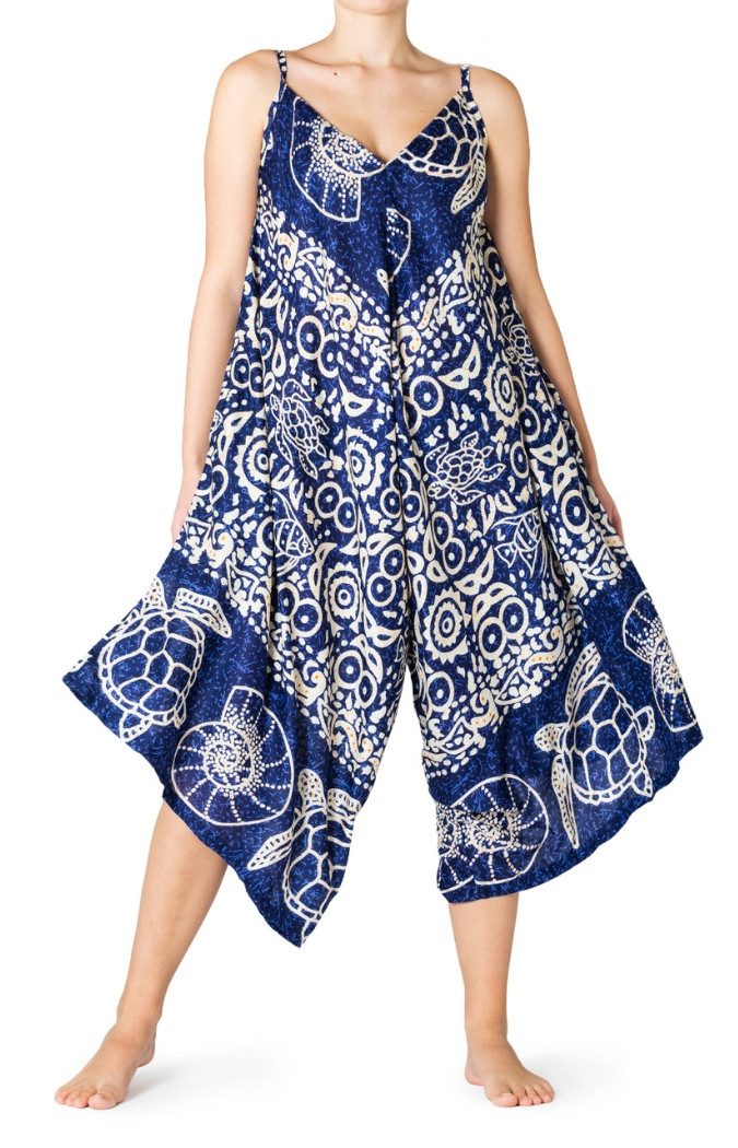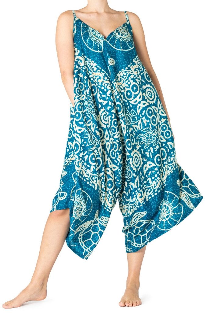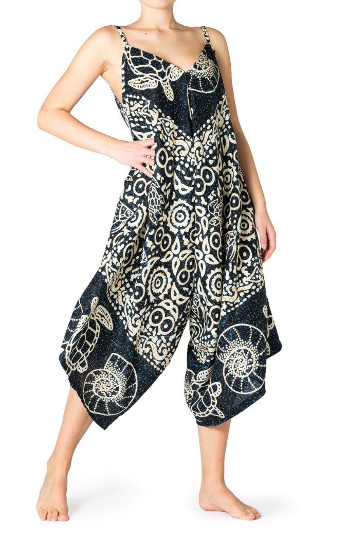 Dieser lässige Boho-Jumpsuit mit exotischem Schildkröten-Print bringt Urlaubsfeeling in Deinen Alltag! Das weite Bein, der lockere Schnitt und die fließende, atmungsaktive Viskose machen diesen Overall perfekt für warme Tage und Reisen. Dank verstellbarer Träger bietet der Einteiler eine individuelle Passform – stilvoll, bequem und ein echter Blickfang im Ethno-Style.