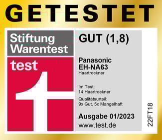 Der Panasonic EH-NA63 erzielt im Vergleichstest des Magazins „test“ der „Stiftung Warentest“ mit 13 weiteren Haartrocknern das Gesamtergebnis „GUT (1,8)“. Das Gerät frisiert „gut“: Es überzeugt u. a. beim Trocknen, bei kalter Luft und mit hoher Frisierbarkeit. Die Handhabung ist am besten: Es ist z. B. einfach zu reinigen und die Düsen sind „sehr gut“ drehbar. Außerdem ist es „sehr gut“ haltbar und sehr sicher. Der Haartrockner erreicht im Test das zweitbeste Gesamtergebnis.