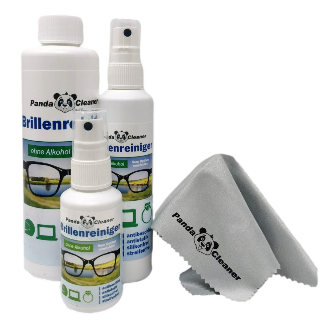 Lieferumfang | 1 x PandaCleaner Brillenreiniger Nachfüllflasche 250ml, Sprühflasche 100ml & 50ml & 1 x Mikrofasertuch |