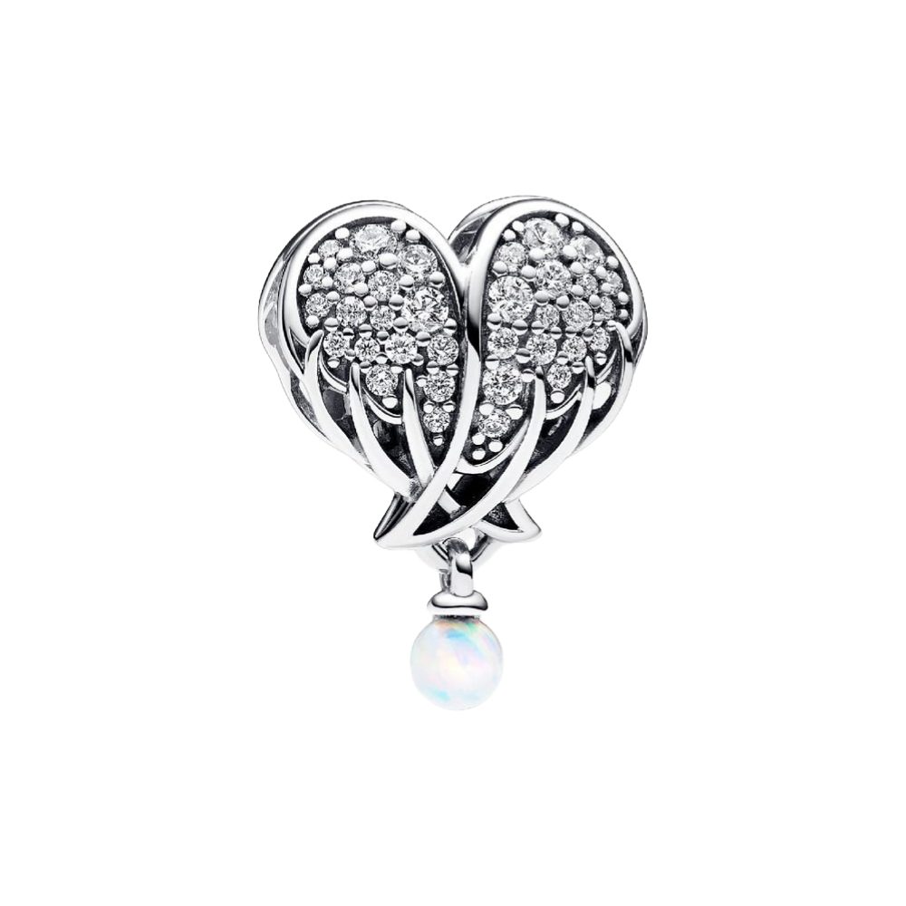 Ein Anhänger, der Schönheit und Symbolik miteinander vereint: Das Herz aus schimmerndem Sterling Silber wird von filigranen Engelsflügeln geformt und mit funkelnden Zirkonia besetzt. Unterhalb des Motivs schwingt ein kleiner synthetischer Opal, dessen irisierender Glanz das Design vollendet und ihm eine himmlische Note verleiht. Dieses Schmuckstück steht für Liebe, Schutz und Geborgenheit – Werte, die in seiner Gestaltung stilvoll eingefangen sind. Dank seiner harmonischen Maße passt es perfekt zu Pandora Moments Armbändern und Ketten und lässt sich sowohl allein als Blickfang tragen als auch mit weiteren Anhängern kombinieren. Ein detailreicher Charm, der Gefühle sichtbar macht und jede Schmuckkollektion bereichert.