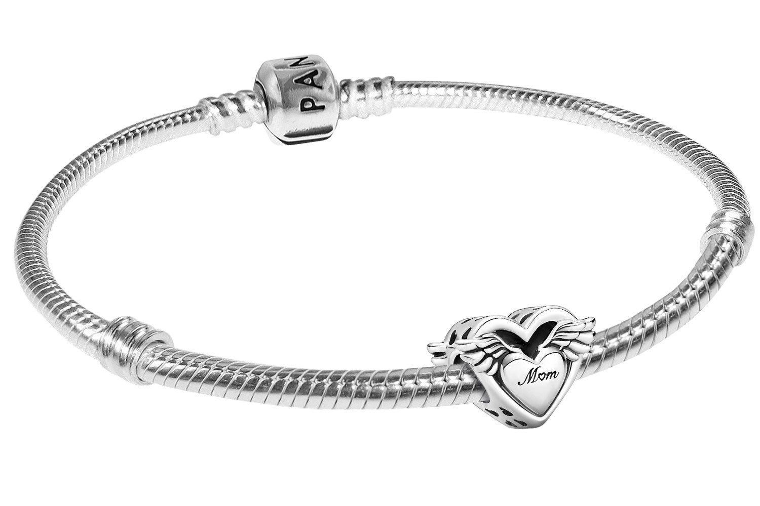 Armband und Bead aus poliertem 925 Sterlingsilber, polierte Schlangenkette, Stärke 3 mm, Clip-Verschluss mit geschwärzter Logo-Gravur, patentierte Gewinde unterteilen das Armband in drei Abschnitte, Herz-Charm verziert mit kleinen Engelsflügeln, Gravuren "My Angel" und "Mum", seitlich ausgestanzte Herzchen