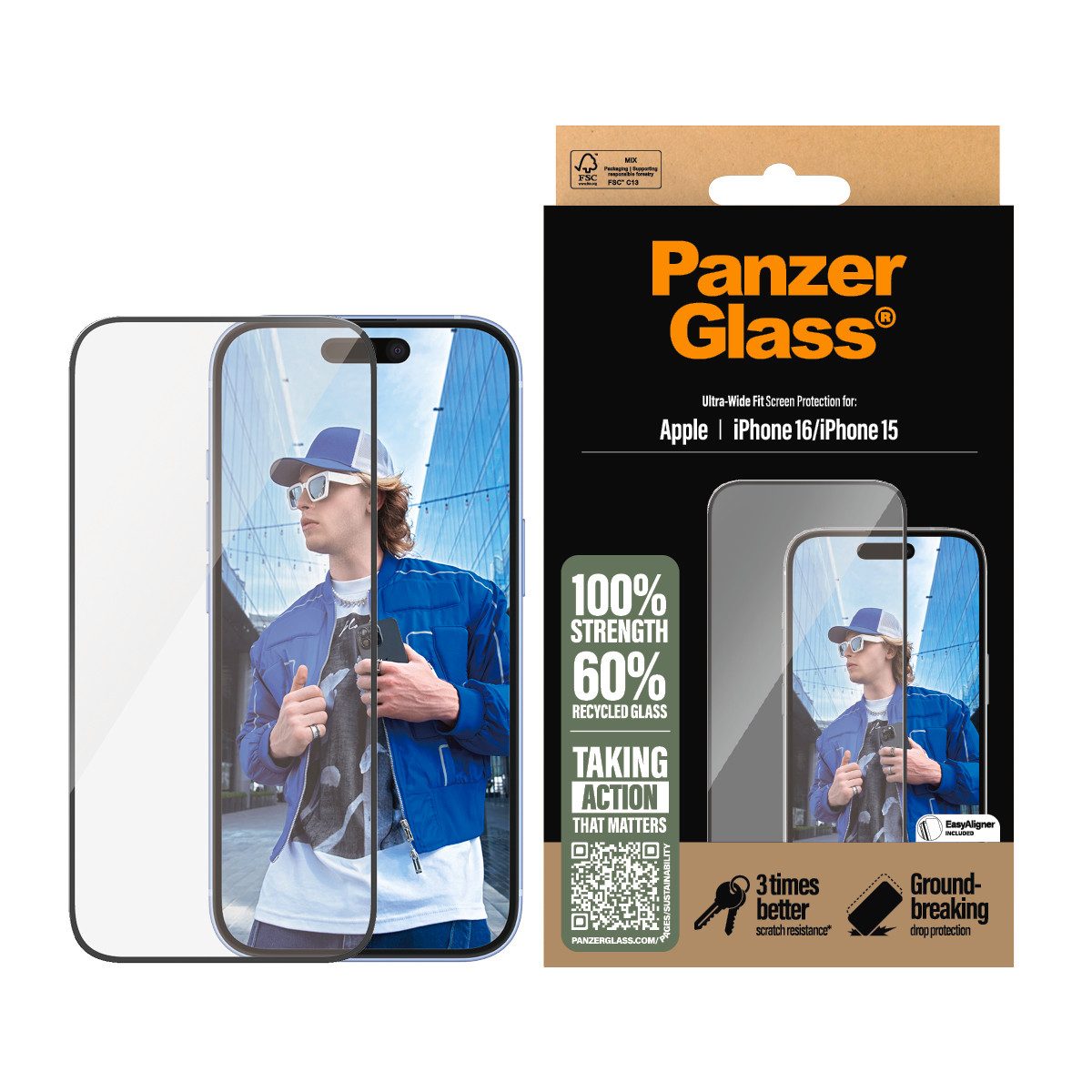 Lieferumfang | PanzerGlass Ultra-Wide Fit, Feuchttuch, Mikrofasertuch, Staubentferner Sticker |