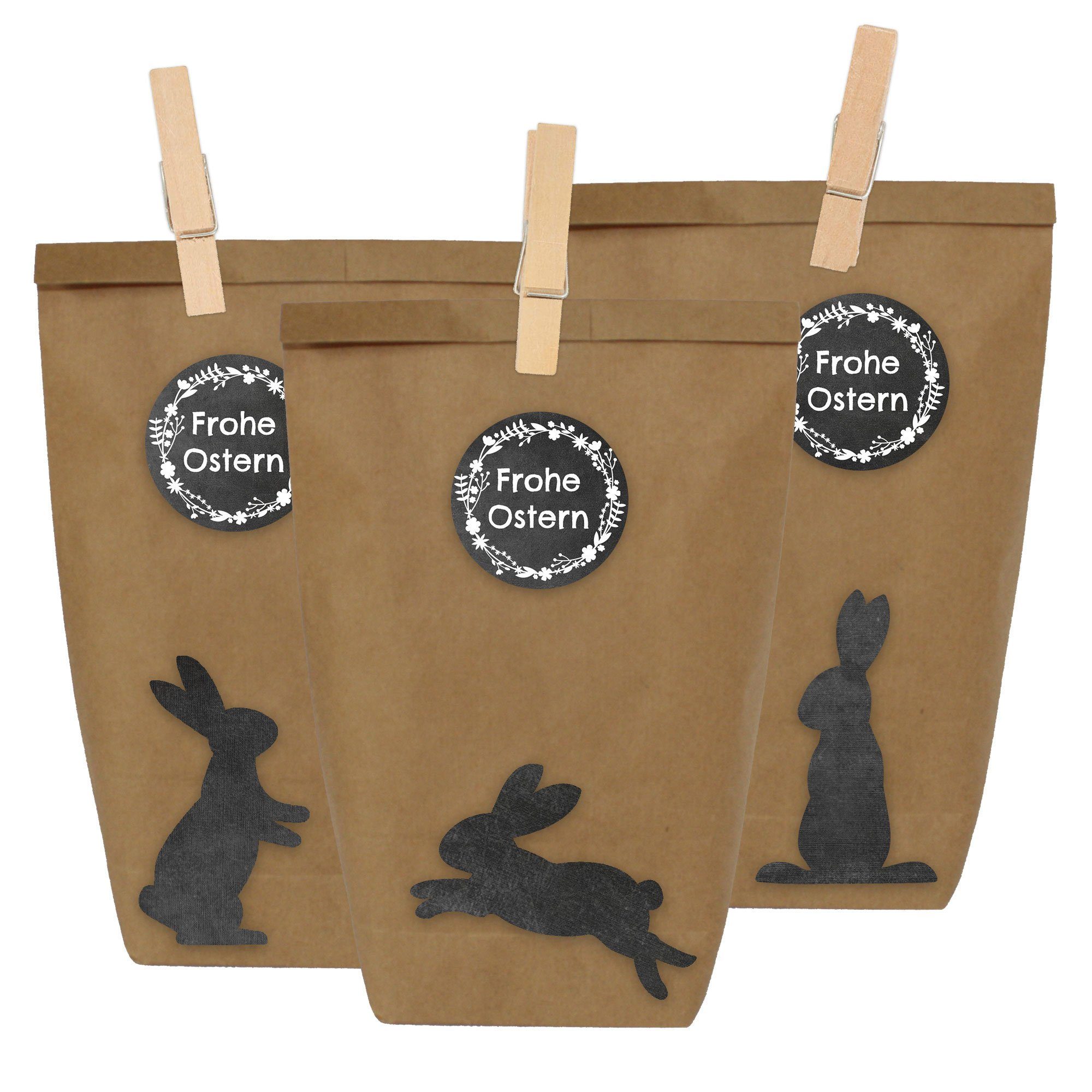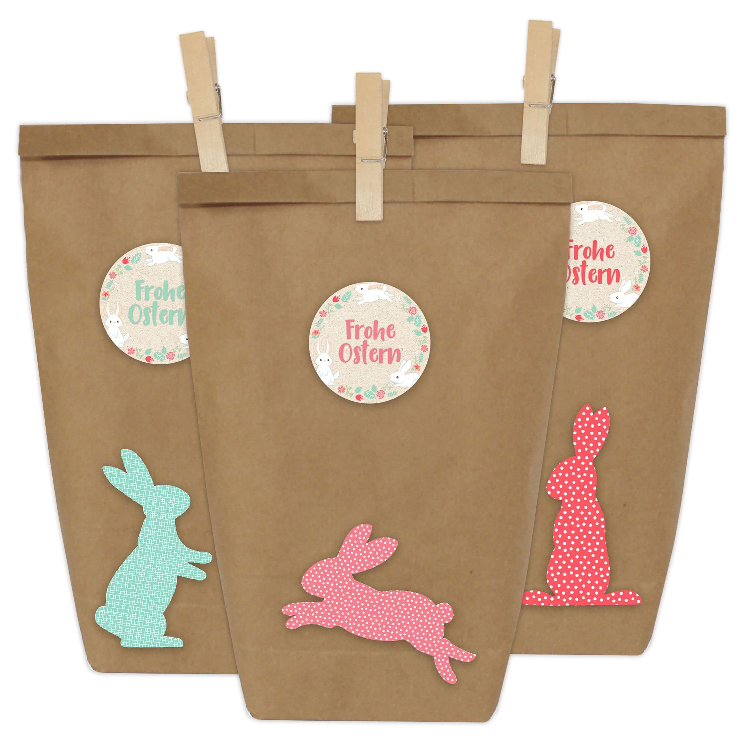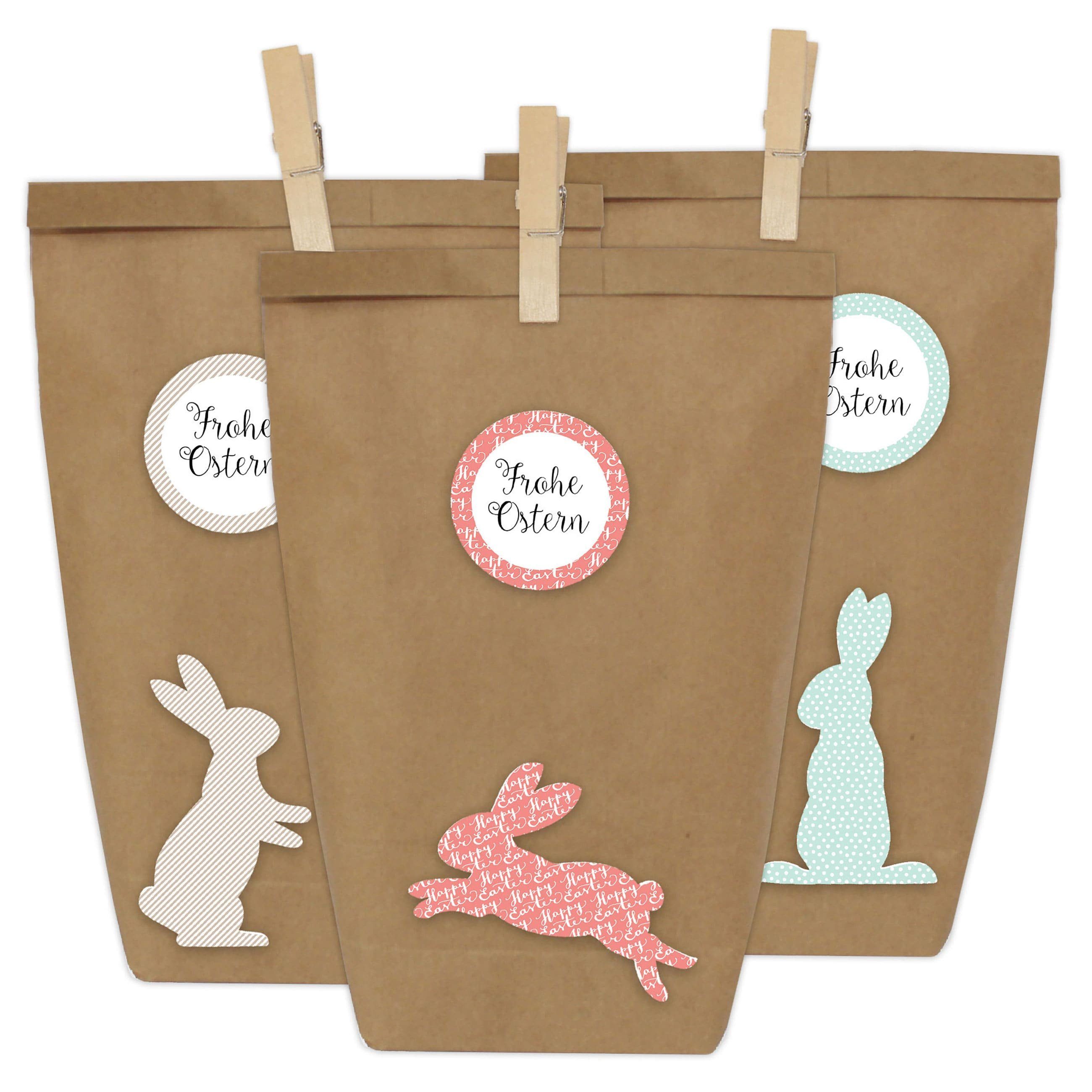 12 DIY Geschenktüten zu Ostern zum selber Basteln und Befüllen - do it yourself Osternest mit 12 Papiertüten und Osterhasen Aufklebern - Design 15 Hast du eine ganze Kinderschar, die an Ostern mit Geschenken versorgt werden will? Oder veranstaltest du ein Osterbrunch und suchst noch nach der passenden Tischdekoration? Das Verpacken von Ostergeschenken kann langwierig und anstrengend sein, gerade dann, wenn es viele sind - mit unserem Bastelset muss es das nicht sein! Das Verpackungs-Set enthält 12 Geschenktüten aus braunem Kraftpapier, Holzklammern und dazu passende Sticker. Nach dem Befüllen kannst du die Ostertüten damit ohne großen Aufwand ganz individuell und hübsch dekorieren. Das Tolle ist, die Tüten sprechen nicht nur Kinder an. Sie eigenen sich für jede Altersgruppe! Befülle sie mit Naschereien und kleinen Aufmerksamkeiten, verschließe sie mit einer Klammer und verziere sie mit einem Aufkleber - fertig! Lieferumfang