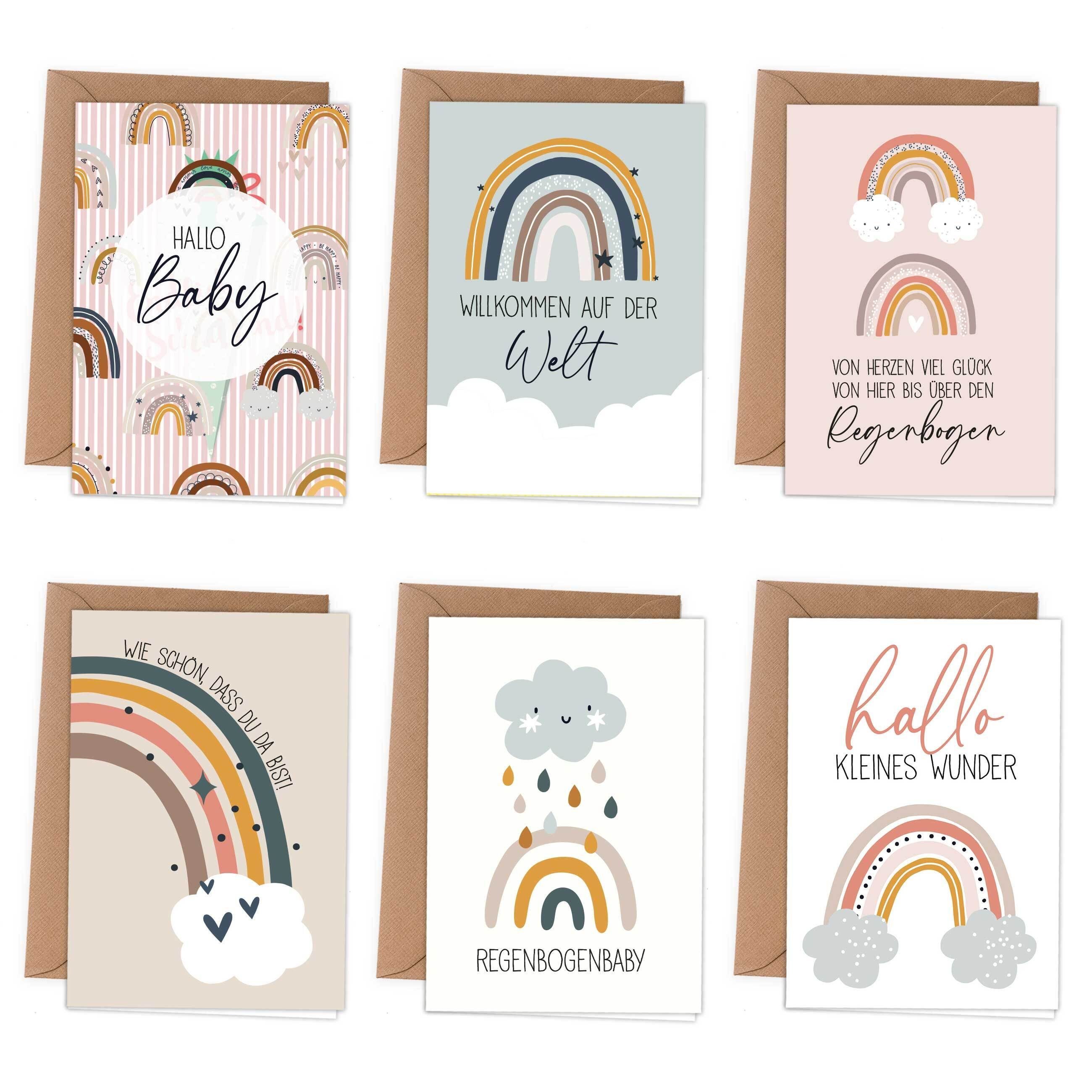 Ein Set beinhalten 6 stabile Klappkarten inklusive Umschlag zum Verschicken und Verschenken. Die Karten lassen sich auch schön an Geschenken zur Geburt anbringen und peppen somit jedes Präsent auf – ideal um auch den Namen des Beschenkten mit aufzuschreiben! Die Briefumschläge (Briefkuvert passend für C6-Inhalte) werden aus 100% recyceltem Altpapier hergestellt und sind nassklebend. Все Karten werden auf hochwertigen Postkarten-Chromokarton (300g/m²) gedruckt und anschließend auf DIN A6 Размер gefalzt. Lieferumfang: 6 hochwertige Klappkarten als Grußkarte zur Geburt – 6 verschiedene Motive (300g/m² Papier) 6 dazu passende Umschläge aus Recycling-Papier