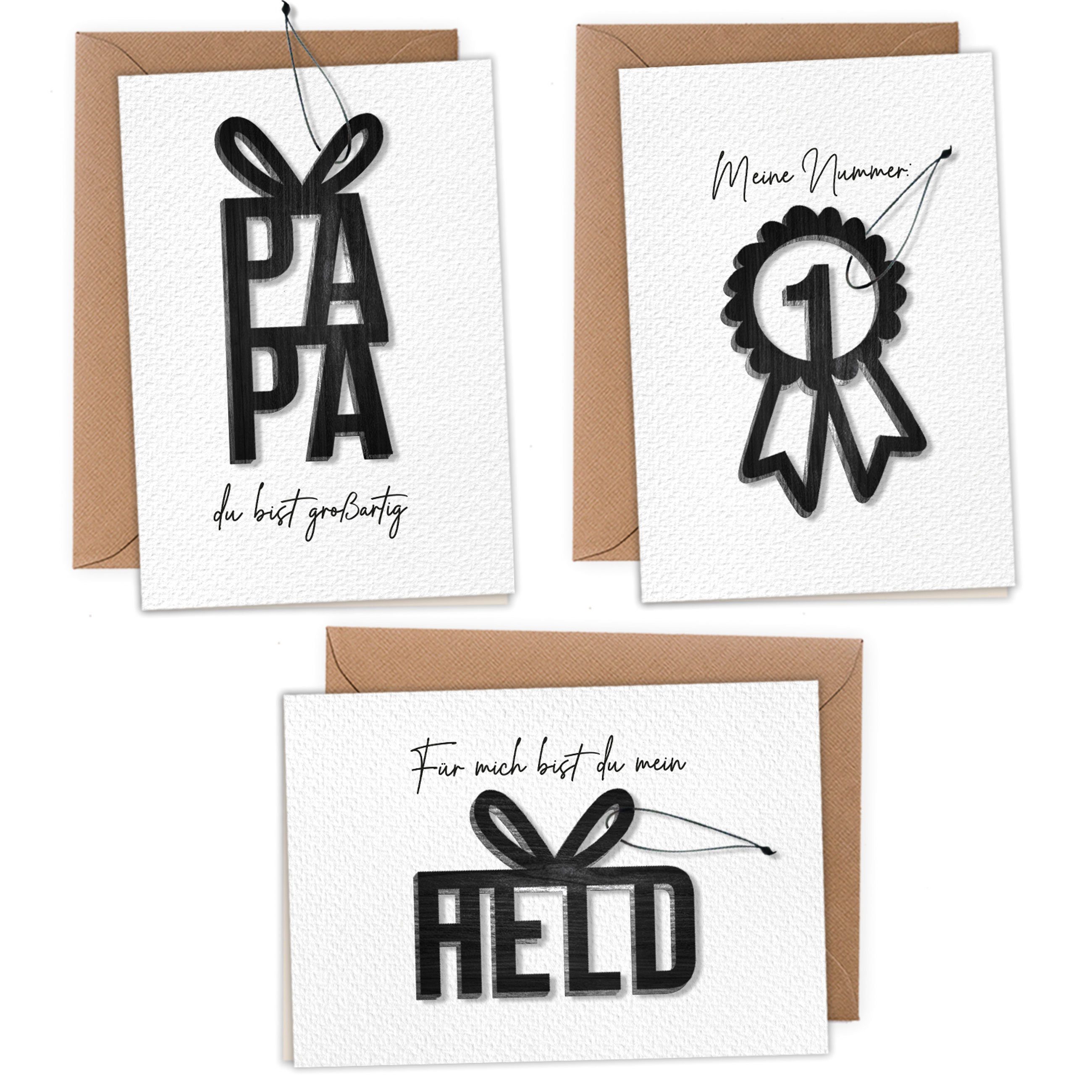 Hier erhältst du tolle Klappkarten mit tollen Holzcutouts in edlem schwarz zum Vatertag. Jede Karte ist aus hochwertigem Papier gefertigt und verfügt über ein einzigartiges Holzcutout-Design, das deinem Vater zeigt, wie sehr du ihn schätzt. Die Karten werden mit 3 Packpapier-Umschlägen und Anhängern für Papa geliefert, so dass du sie personalisieren und verschenken kannst, wie es dir gefällt. Mit ihren eleganten und ansprechenden Designs sind diese Klappkarten eine wunderbare Möglichkeit, deinem Vater eine Freude zu bereiten.