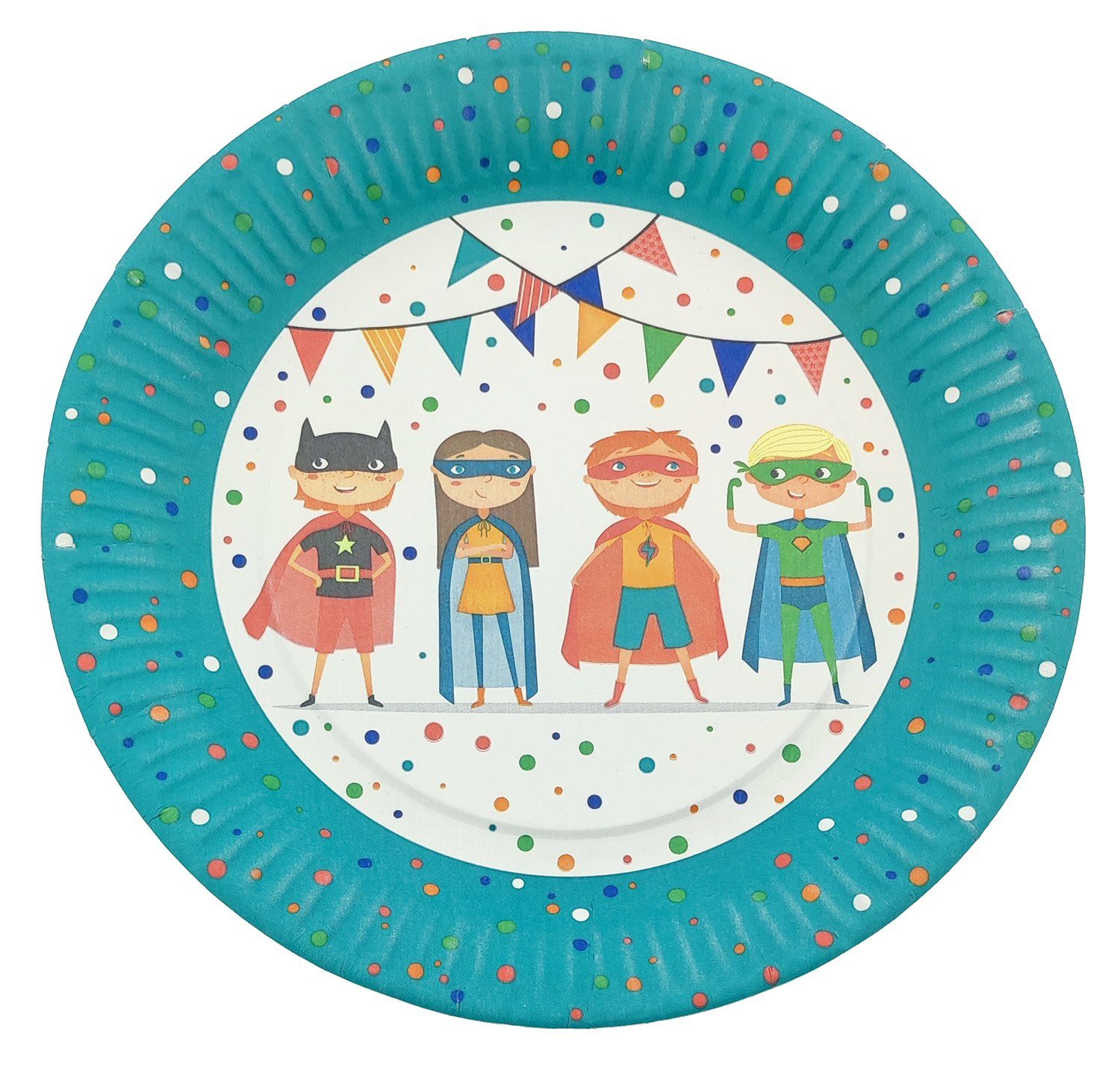 Die einweg Pappteller sind perfekt für Ihre nächste Feier, egal ob Mottoparty oder Kindergeburtstag. Die Teller haben einen Durchmesser von 23 cm. Das Motiv sind Superhelden auf einer Feier. Die Partyteller sind zu 100 % aus Pappe und enthalten kein Plastik somit sind sie absolut lebensmittelecht.