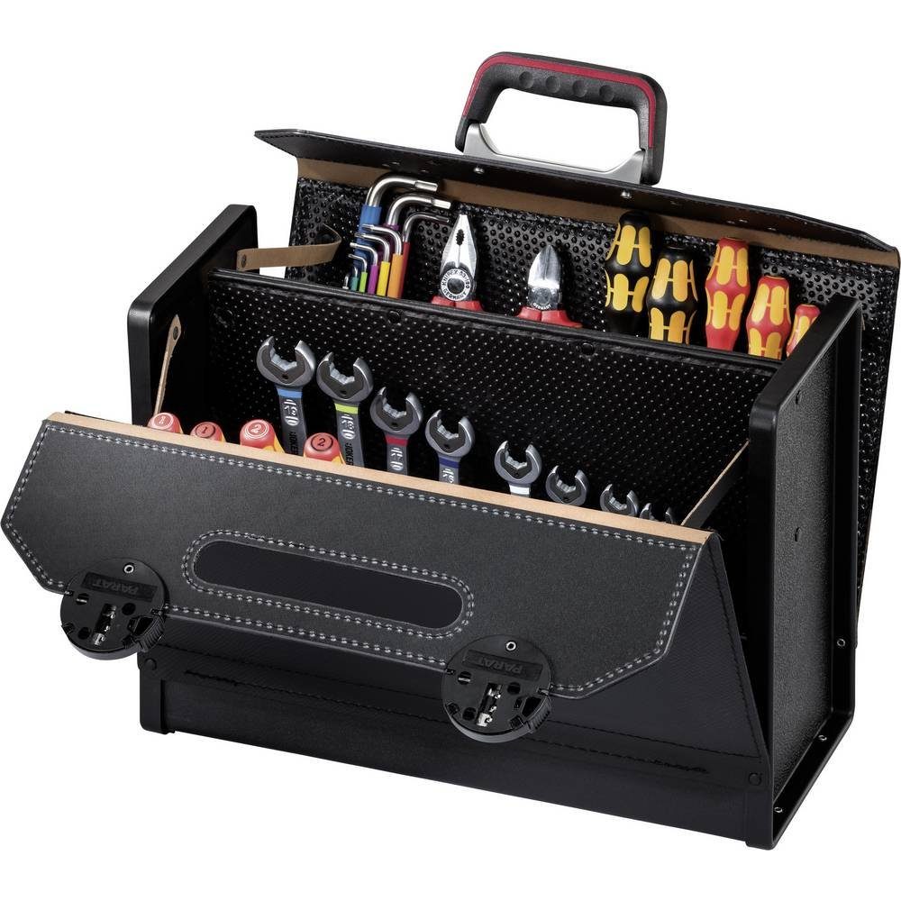 Die hier angebotene Werkzeugtasche gehört in die TOP-LINE-Serie von PARAT, die zusammen von professionellen Anwendern für professionelle Anwender entwickelt wurde. Die Tasche ist sehr gut für den täglichen Arbeitseinsatz von Handwerkern und Servicetechnikern verschiedenster Gewerke und Fachrichtungen geeignet und besitzt mit nur rund drei Kilogramm ein geringes Eigengewicht. Sie wird aus einem extra starken und geprägten Leder gefertigt, das vor Kratzern und Stößen gut schützt und die Tasche zu einem Begleiter macht, der über viele Jahre lang zuverlässig genutzt werden kann. Sie bietet eine Menge Stauraum, in dem sich viele gängige Werkzeuge und auch Materialien ohne Probleme unterbringen lassen. Die Vorder- und Rückwand lassen sich zum Teil aufklappen, und insgesamt verfügt die Tasche über 16 Einsteckfächer und CP-7 Werkzeughalter an der Mittelwand. Die Farbe der Werkzeugtasche ist schwarz. Tragen lässt sich die Tasche bequem mithilfe eines Kunststoffgriffs. Verschlossen werden kann die Werkzeugtasche ganz einfach mit zwei Rasterschlössern..