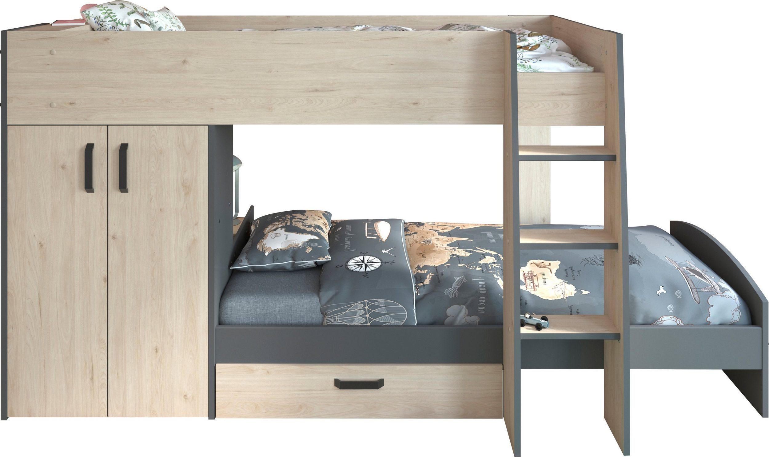 Im integrierten Kleiderschrank, oder auf der eingebauten Kleiderstange finden die Klamotten ihren Platz. Praktisch mit viel Stauraum: das Etagenbett »Stim« von Parisot für zwei Personen.