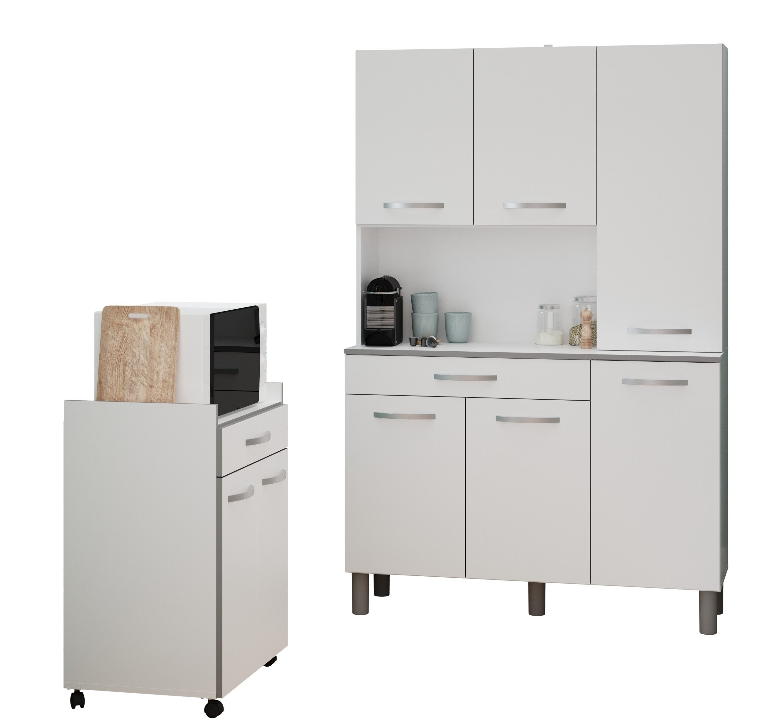 Set beinhaltet | 1 Buffet (120x185x40cm)-oben drei Türen - mittig offenes Fach, unten ein Schubkasten und drei Türen- und ein Beistellschrank auf Rollen (60x82x45cm) - 1 Schubkasten, 2 Türen - dahinter 2 Fächer |