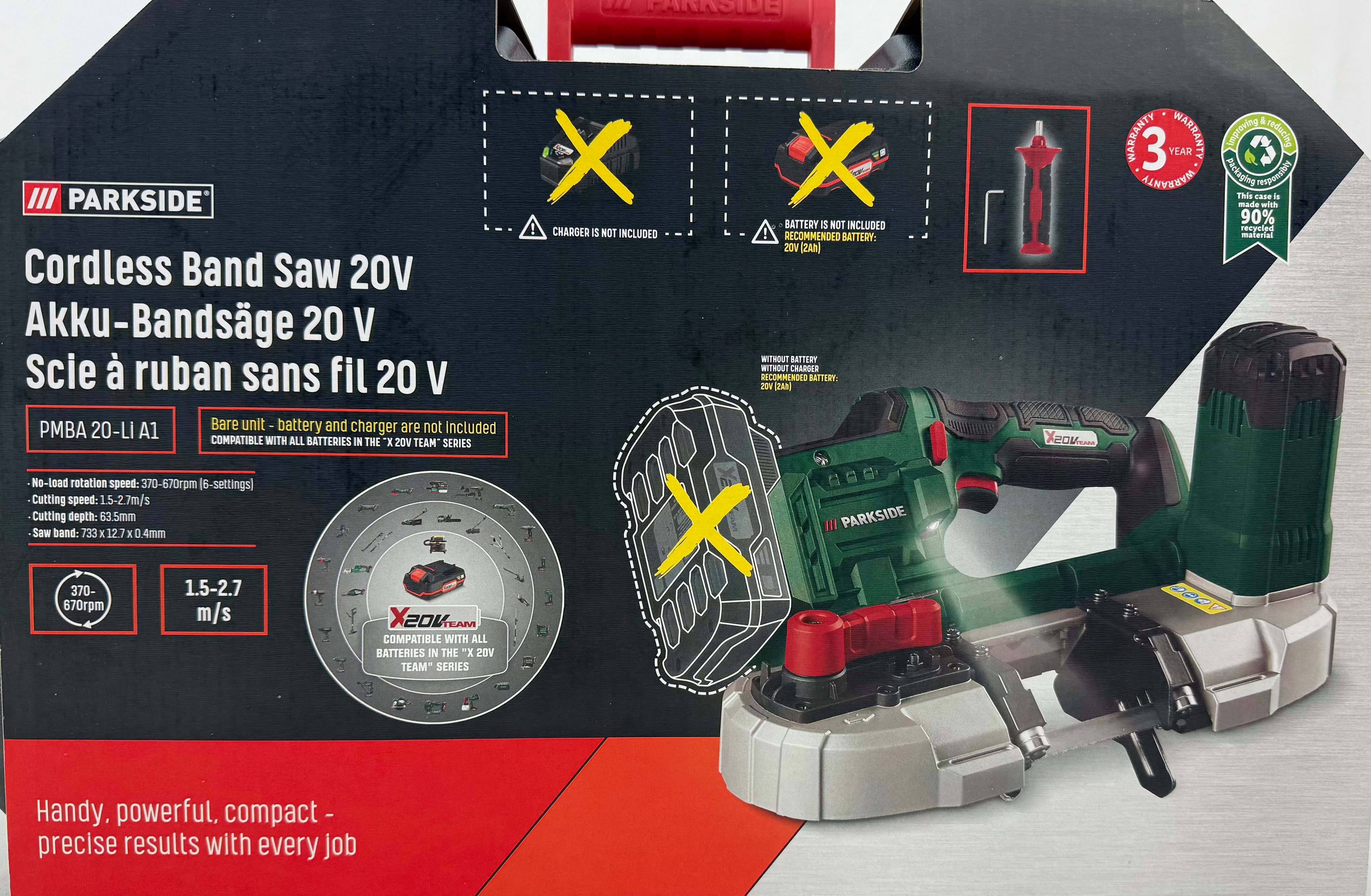 Lieferumfang | Enthaltenes Zubehör: 1 Sägeband (vormontiert), 1 Innensechskantschlüssel (am Gerät verstaut), 1 Zusatzgriff |
