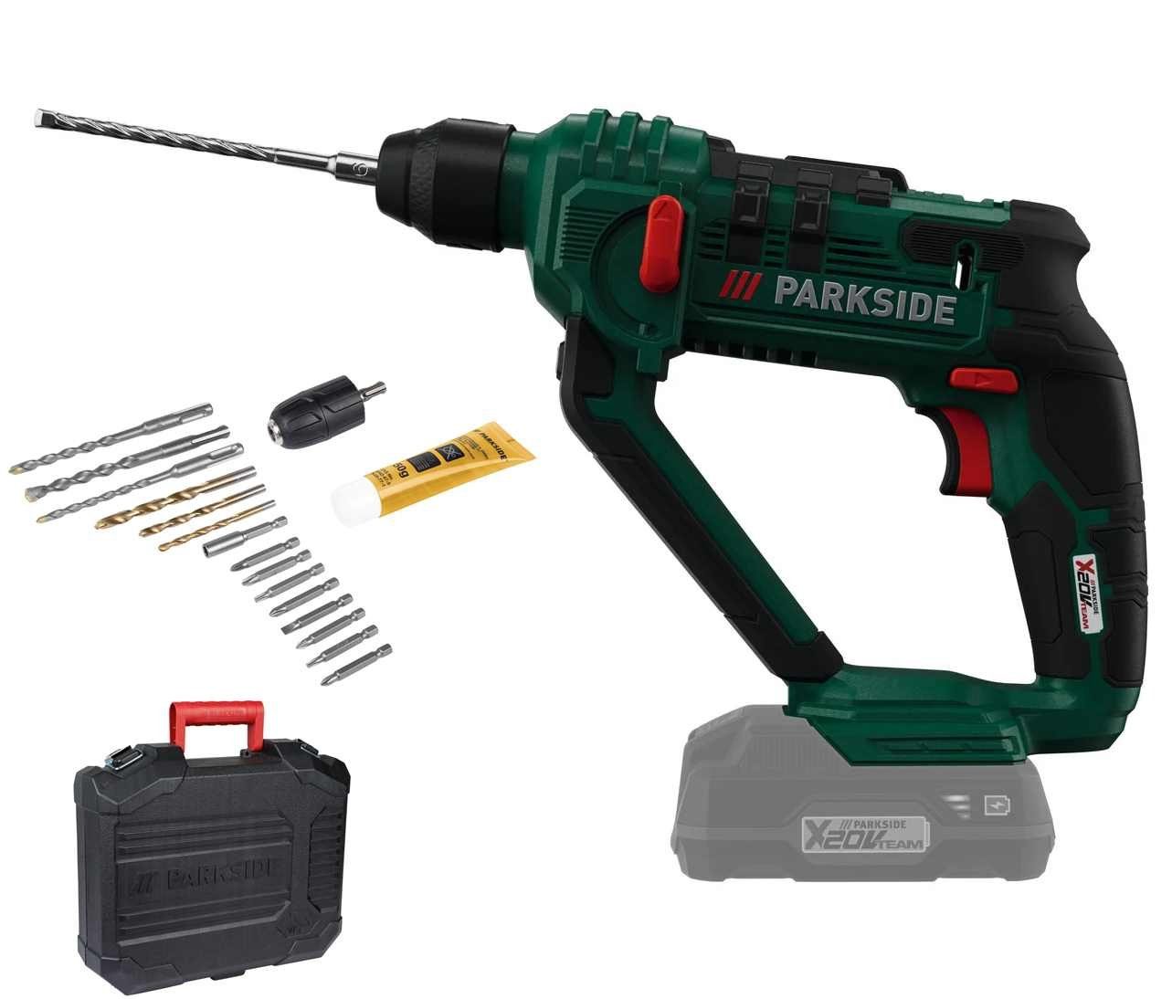 Enthaltenes Zubehör: 3 SDS-Plus-Bohrer (6/8/10 x 150 mm), 3 HSS-Bohrer-Bits mit Rundschaft-Aufnahme (5/6/8 mm), 8 Schrauber-Bits (50 mm), 1 Bit-Verlängerung, 10-mm-Schnellspannbohrfutter für Rundschaftbohrer, 50 g Fett