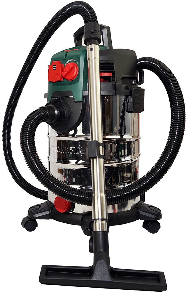 Lieferumfang | Enthaltenes Zubehör: 1 Edelstahl-Teleskoprohr, 1 Handgriff mit Luftregulierung, 1 Saugschlauch (3 m), 2 Bodendüsen (für trockene und nasse Flächen), 3 Aufsätze (Polster-, Fugen- und Autodüse), 1 Faltenfilter (auswaschbar), 1 Papierfilterbeutel, 1 Powertool-Schlauch (1 m), 1 Powertool-Reduzierstück zur externen Staubabsaugung, 1 Zubehörbeutel |