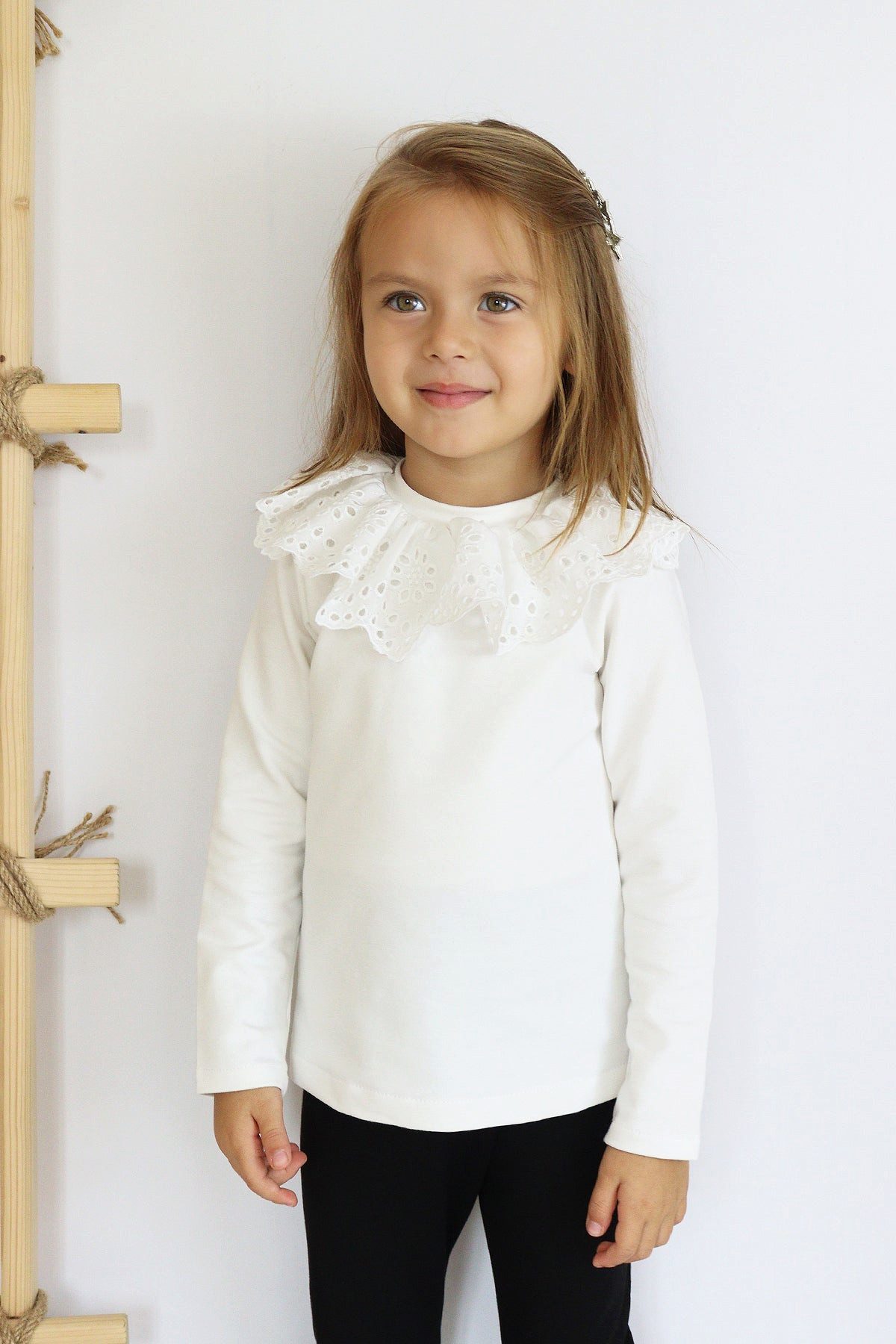 Dieses weiße Langarmshirt mit Spitzendetails ist ein Must-have in der Kindermode. Es ist zeitlos, vielseitig und lässt sich mit vielen Kleidungsstücken kombinieren.
