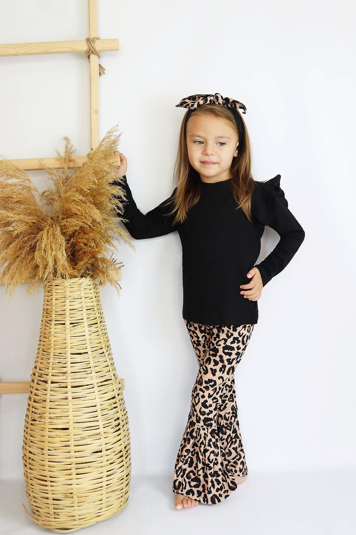 Das Set besteht aus einem schwarzen Oberteil mit langem Arm, einer modischen Schlaghose und einem Haarband mit hübschen Leopardenmuster. Dieses Set ist perfekt für modebewusste Mädchen.