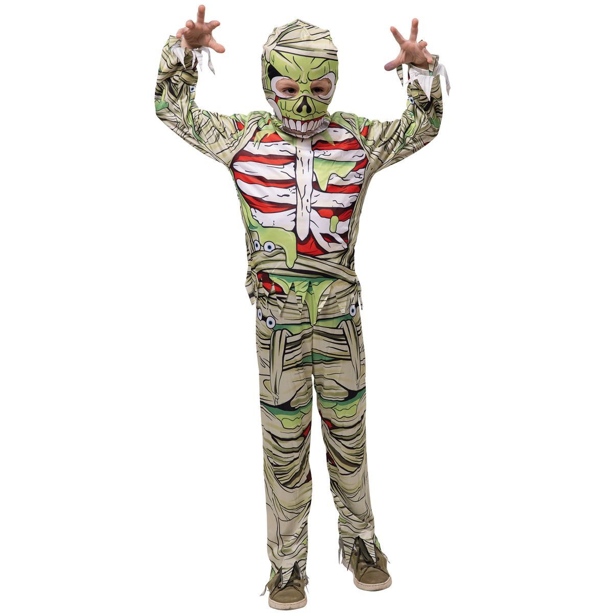 Die mumienartigen Bandagen sind in ein comicartiges, grünes Schleim-Design getaucht, das glibberig und realistisch aussieht, ohne wirklich schleimig zu sein! Gezackte Enden an Beinen, Armen und der Taille verstärken den zerfransten Mumien-Look, und die lustigen Kulleraugen sowie die freiliegenden Knochen sorgen für eine perfekte Mischung aus Grusel und Humor. Die bedruckte Haube mit furchterregendem Mumiengesicht rundet das Kostüm ab.