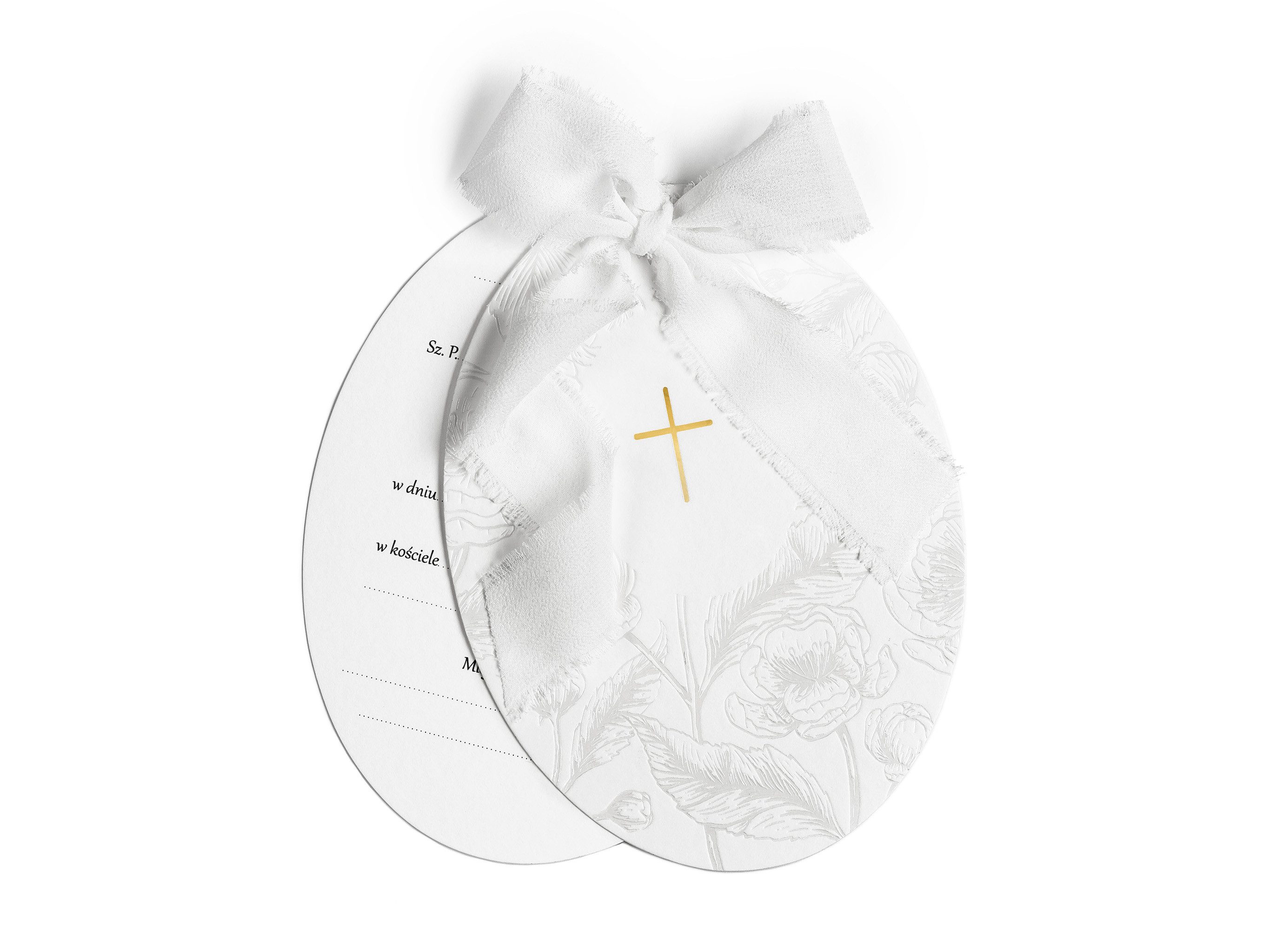 EINLADUNG SET: Das Set enthält 10 Kommunionseinladungen mit Kreuzmotiv und Blumen, 10 Umschläge und ein weißes Band zum Zusammenbinden der ovalen Karten
