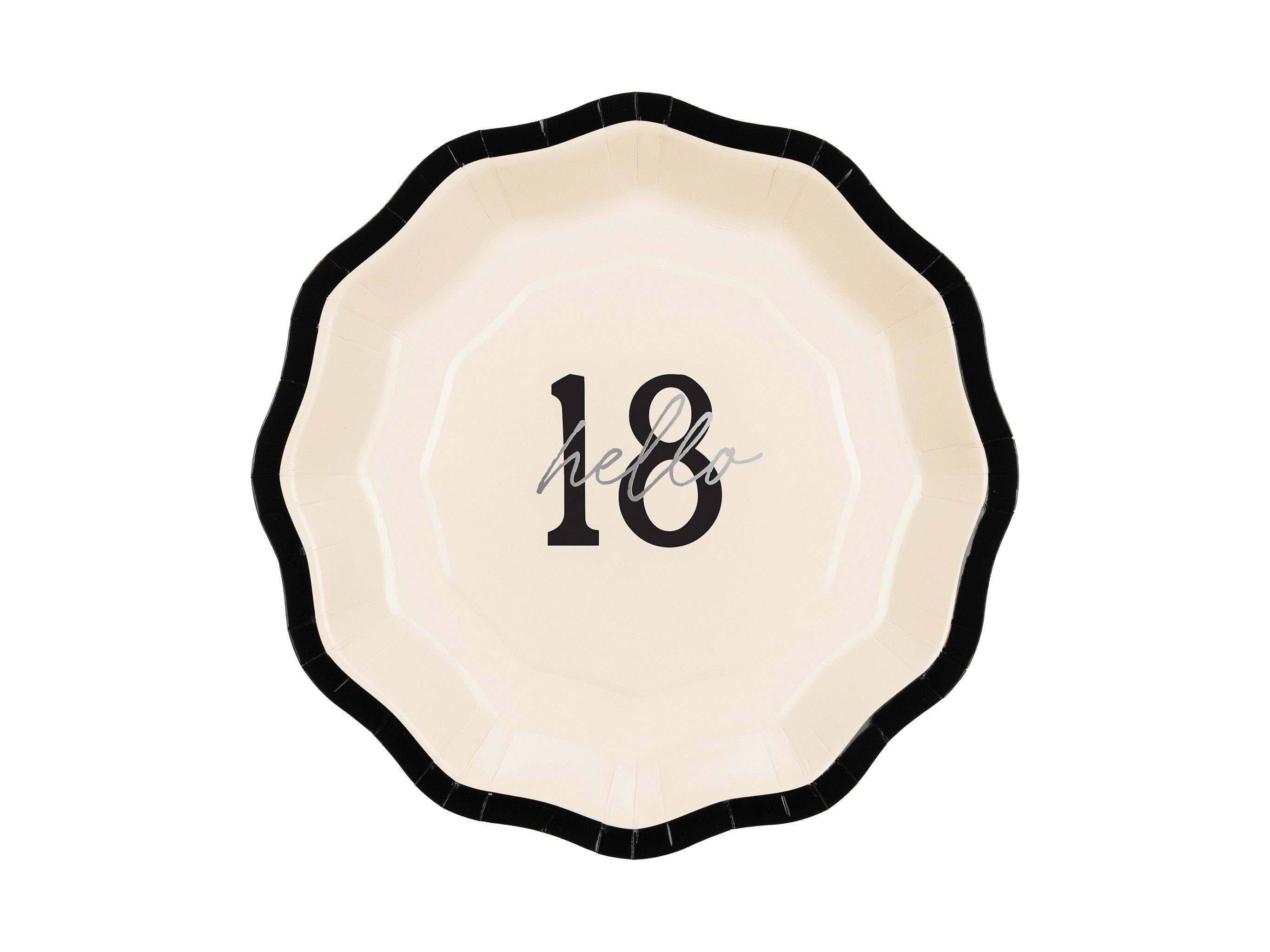 Pappteller / Pappgeschirr / Papierteller / Partyteller Hello 18 Material: Pappe / Papier, beschichtet - Размер (D): ca. 18 cm - Packungsinhalt: 6 Einweg - Teller - Farbton: ivory - elfenbein - cremeweiß - silber - schwarz - runde Pappteller, einmal verwendbar - plastikfrei und somit nachhaltig - für Lebensmittel bis +40° C geeignet, halten die Mikrowellenwärme nicht aus Mit diesem stilvollen Tellerset machen Sie jede Party zu einem echten Highlight! Dieses Einweggeschirr mit schwarzem, gewellten Rand, ist der ideale Begleiter für jeden festlich gedeckten Tisch und bietet schnelle sowie thematisch passende Serviermöglichkeiten. Sie treffen mit diesem schönen Wegwerfgeschirr garantiert die richtige Wahl! Diese schicken Pappteller sehen einfach super aus, sorgen für ein unbeschwertes Essvergnügen und lassen sich als Einwegteller schnell entsorgen. Die stabilen Papierteller sind besonders für Events, Feiern und Feste geeignet und lassen sich sehr gut mit anderem Partygeschirr sowie Partyzubehör und Partybedarf kombinieren. Dieses Party Deko Zubehör ist für jede festliche Tischdeko, Tafeldeko und Partydeko unverzichtbar! Muster & Motiv: Zahl 18, Schriftzug Hello, Schriftzüge, Schrift, Botschaft, Aufschrift, schwarze Umrandung / Wellenrand / Kontur - Anlässe & Saison: 18. Geburtstag Mädchen und/oder Junge / 18 Jahre Geburtstag, Volljährigkeit, Geburtstagsparty, Geburtstagsfeier, Jubiläum, Überraschungsparty - Stil & Aufmachung: elegant, Vintage, chic, Rockabilly, Retro, Glamour, 40er, 50er Jahre - Farbgruppe: weiß - creme - silber - schwarz