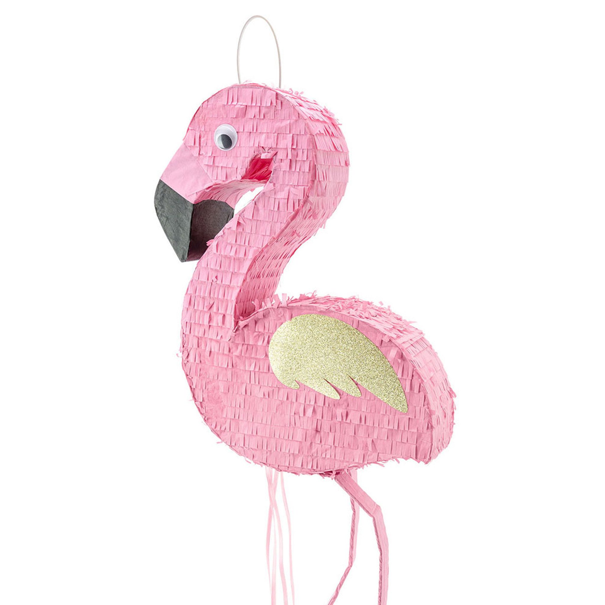 PRODUKT: Piñata Flamingo / INHALT: 1 Stück / GRÖSSE (HxLxB): ca. 55 x 25 x 8 cm / MATERIAL: Papier - Pappe / FARBE: rosa - gold - schwarz